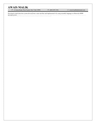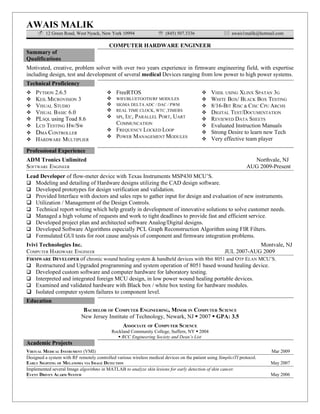 Awais Malik is a computer hardware engineer with over two years of experience in firmware engineering. He has expertise in designing, testing, and developing several medical devices ranging from low to high power systems. He is proficient in languages like Python, VHDL, and Visual Basic. He has worked as a software engineer developing flow meter devices and as a computer hardware engineer developing chronic wound healing systems and handheld devices. He has a Bachelor's degree in Computer Engineering from NJIT and an Associate's degree in Computer Science from Rockland Community College.