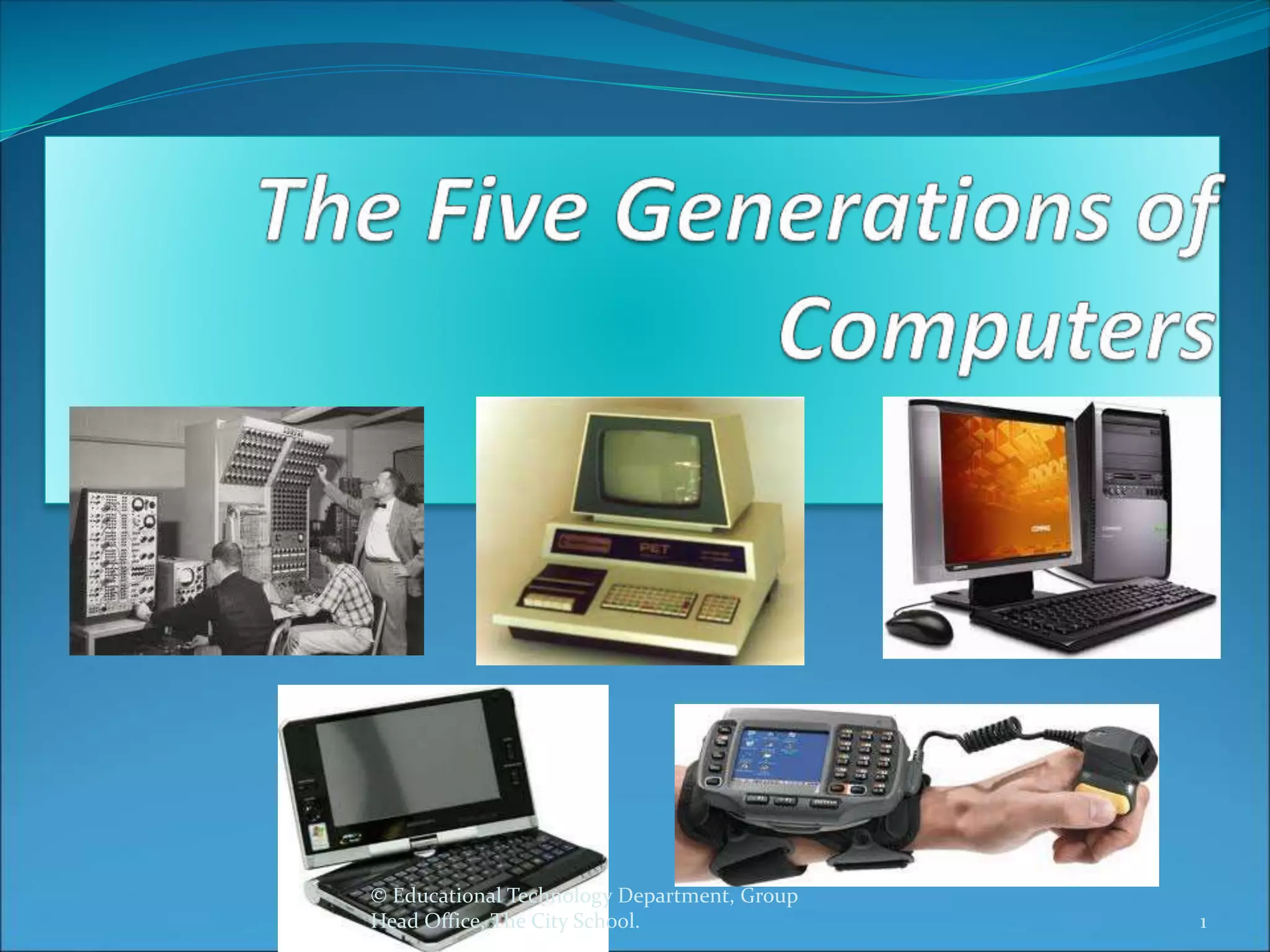 The document discusses the five generations of computers from the 1940s to present. The first generation used vacuum tubes, were room-sized, and relied on machine language. Transistors replaced vacuum tubes in the second generation, which were smaller and used symbolic language. Integrated circuits were developed in the third generation, making computers even smaller. The fourth generation saw the development of microprocessors that put all computer components on a single chip. Current and future computers are exploring artificial intelligence and parallel processing as part of the fifth generation.