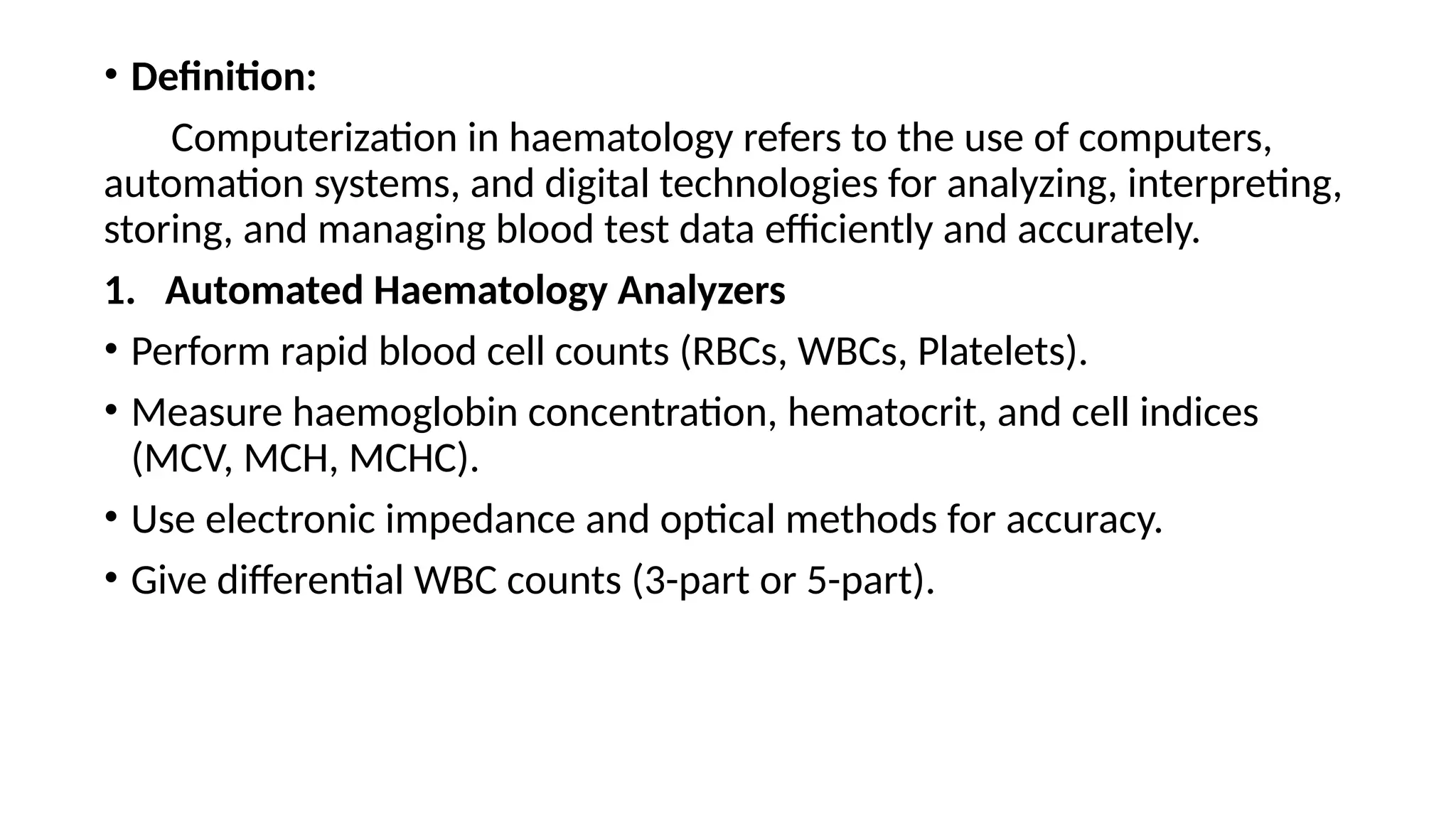 Computerization in hematology involves three key principles: