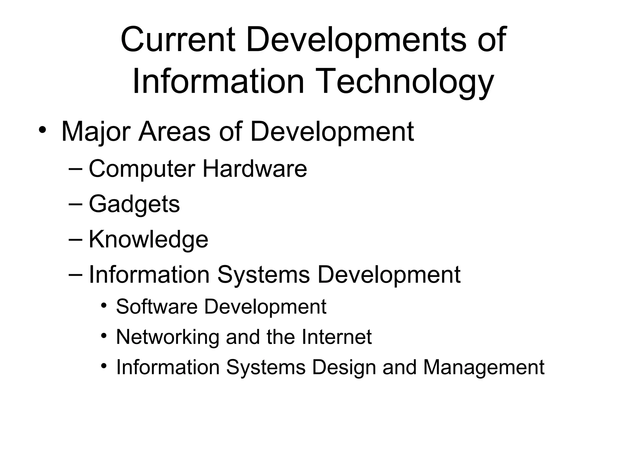 This document discusses the computerization of hospital management information systems through information technology developments. It covers major areas of IT development like hardware, software, and information systems design. The focus is on using current technologies to improve the effectiveness and efficiency of managing healthcare institutions. Specific areas that can be computerized are discussed, like patient services and management systems. Critical components of developing an integrated patient-based health information system and the organization's management information system are outlined, including conceptual frameworks, recommended approaches, and considerations around database design.