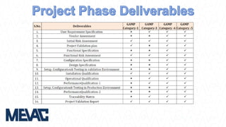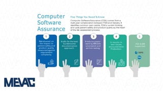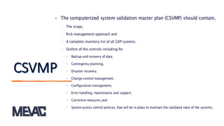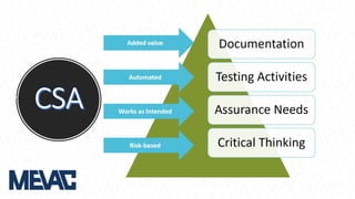 This document discusses Computerized System Validation (CSV) as a critical requirement for Good Manufacturing Practices (GMP), emphasizing the importance of validation in ensuring product quality and regulatory compliance. It outlines the regulatory framework, benefits of CSV, and the lifecycle of validation processes including user requirements, performance qualification, and risk management. The document also highlights the transition from CSV to Computer Software Assurance (CSA) as a future approach for software acceptance in the quality management field.