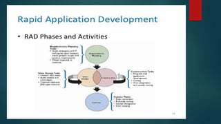 Rapid Application Development (RAD) is an iterative software development process that aims to develop software quickly. It was developed by IBM in the 1980s. RAD uses component-based development, with multiple teams working in parallel on discrete components. The RAD process has four phases: requirement planning, user design, construction, and cutover. In the requirement planning phase, user needs are discussed. The user design phase involves interactive modeling and prototyping. Construction focuses on programming and testing. Cutover implements the new system and trains users. RAD allows for faster delivery but requires skilled teams and commitment to its rapid cycles.