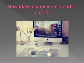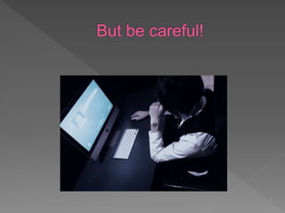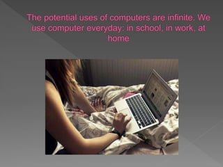 This document discusses different types of personal computers such as desktops, laptops, notebooks, subnotebooks and palmtops. It also warns against calling phone or credit card numbers or downloading pirated files from unknown sources.