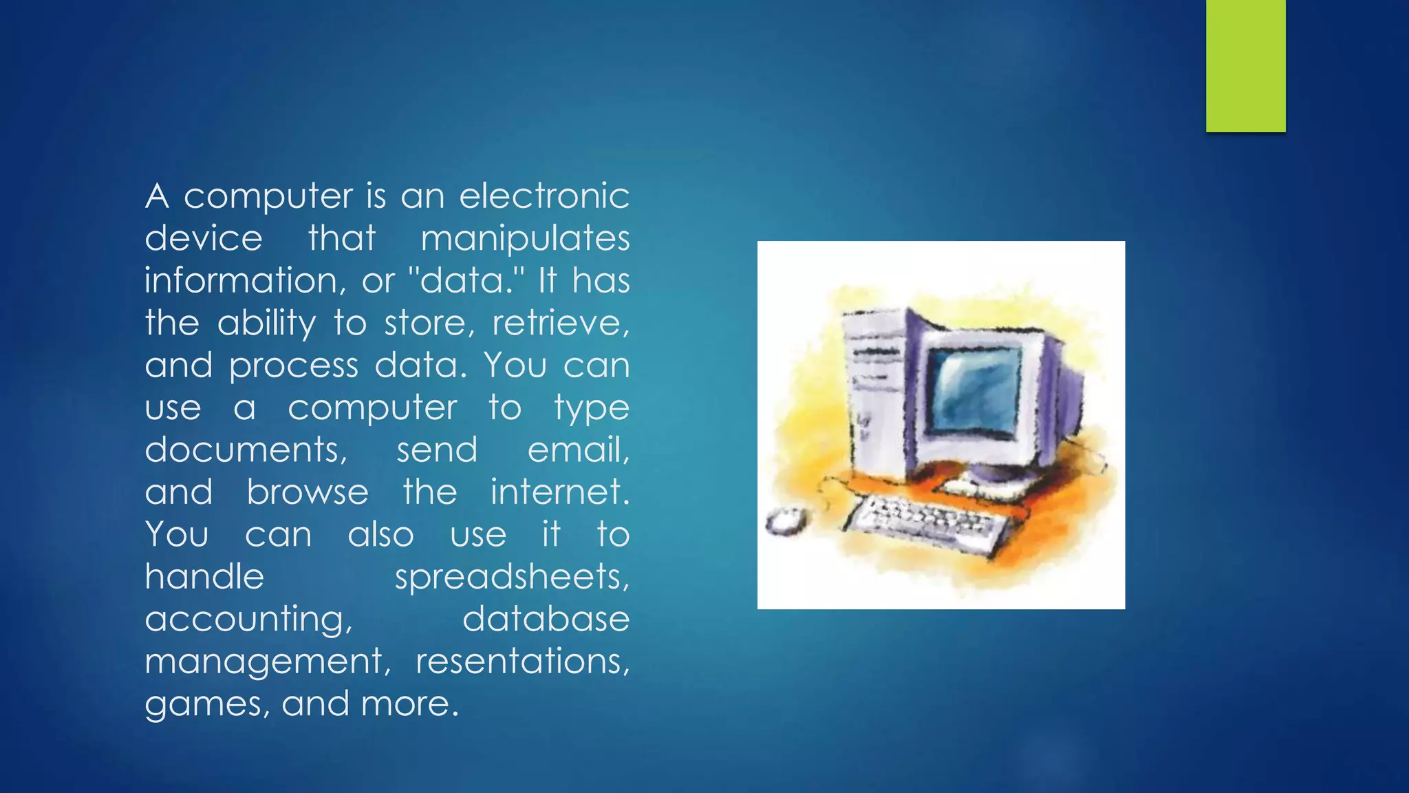 A computer is an electronic device that can store, retrieve, and process data. It allows users to type documents, send emails, browse the internet, manage spreadsheets and databases, and more. An operating system manages computer resources and provides common services for programs. Computer networks allow devices to exchange data through connections established by cable or wireless media. They can be categorized by their scope, such as local area networks, wireless local area networks, wide area networks, and more.