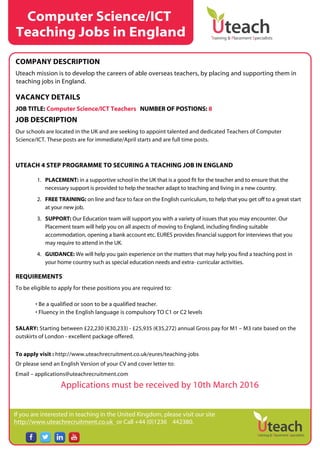 Uteach Recruitment is seeking to fill 8 positions for Computer Science/ICT teachers in schools located in the UK. The company works to place qualified overseas teachers and provide support as they begin teaching and living in a new country. Teachers accepted will receive placement in a supportive school, free online and in-person training on the English curriculum, and guidance from Uteach on gaining experience to find future work. Requirements include being a qualified teacher and fluency in English at C1/C2 levels. The salary range for the positions is £22,230 - £25,935 annually.