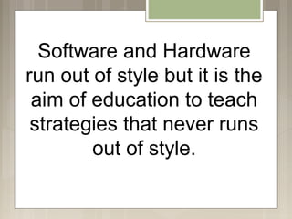 The document discusses the evolution and impact of computers on language teaching, emphasizing the need for strategies that remain effective despite changing technology. It highlights areas where computers struggle, such as machine translation and providing tailored feedback, while also showcasing their strengths in drills, adaptive testing, and multimedia production. The advent of the internet has shifted the focus of computer-assisted language learning from mere automation to enhancing communication and collaboration in education.