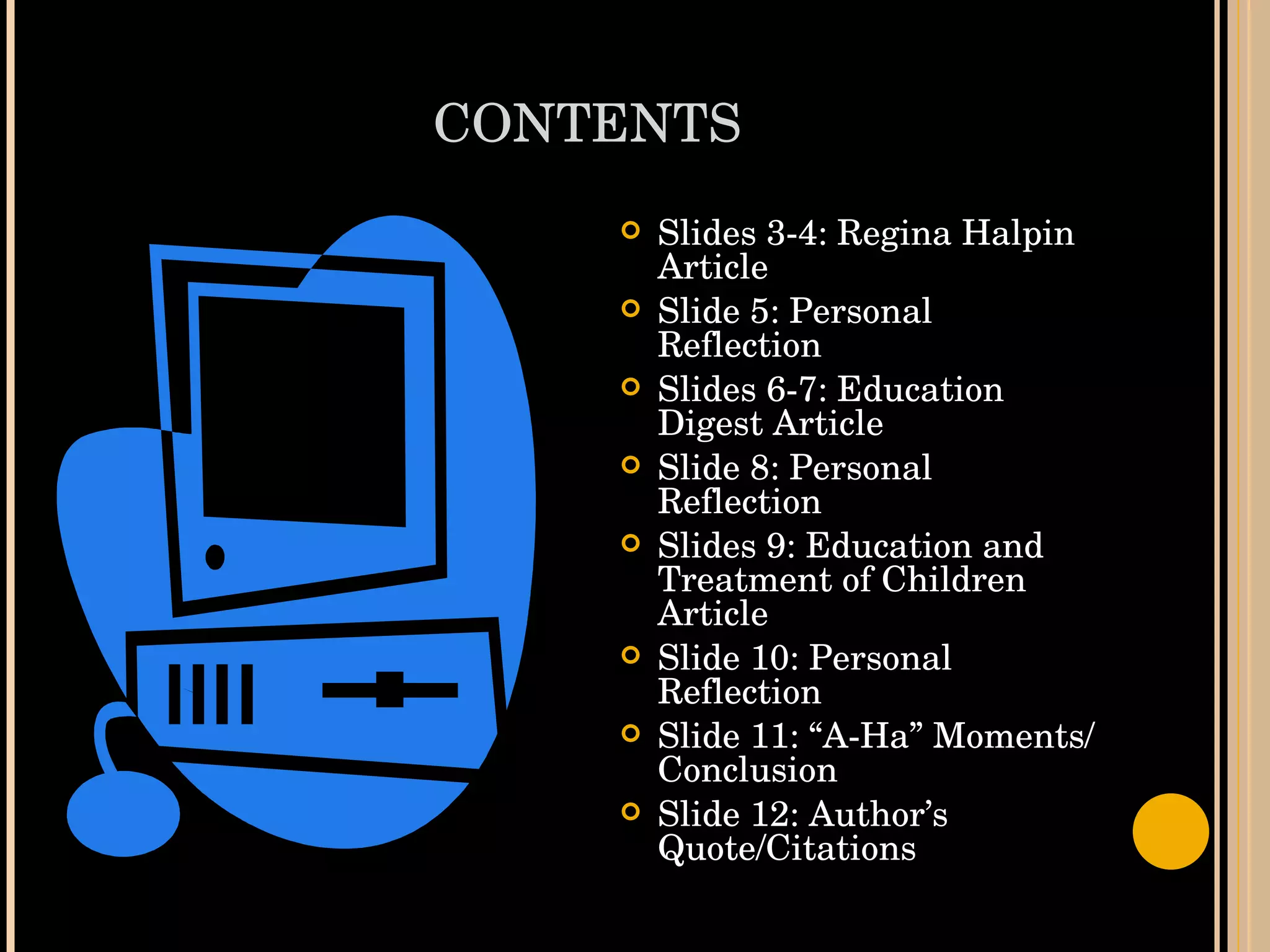 The document discusses integrating computers into elementary classrooms. It provides an overview of an article supporting computer literacy for future teachers and the benefits seen at one California elementary school that installed computers. These benefits included improved math scores, better teacher communication, and enhanced student writing. The document also notes that computers can help students with learning disabilities by allowing independent and self-monitored work.