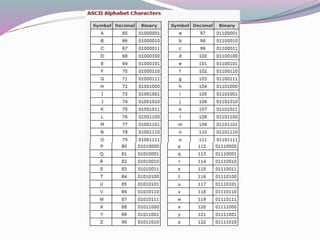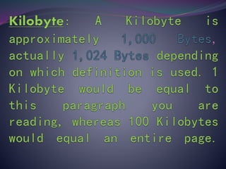 This document discusses units of measurement for digital information storage. It defines the bit as the smallest unit, with a byte equal to 8 bits that can represent a character. A kilobyte is equal to either 1,000 or 1,024 bytes depending on notation, while a megabyte is roughly 1,000 kilobytes. Examples are given for how many bytes or megabytes would be needed to store different amounts of text information.