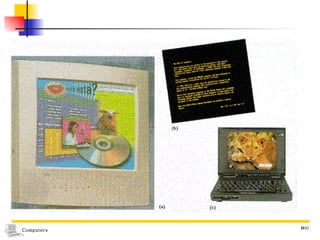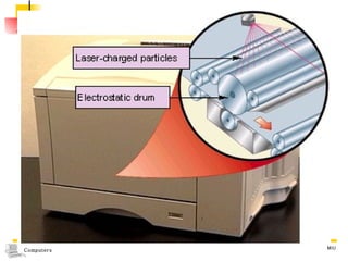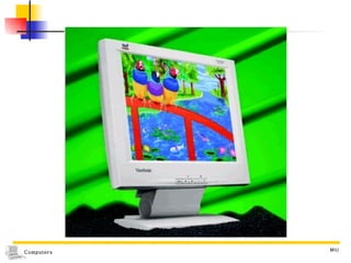 The document summarizes different types of computer output devices and technologies. It discusses cathode ray tube (CRT) and liquid crystal display (LCD) computer screens, including resolution standards. It also covers impact and non-impact printers such as dot matrix, laser, and inkjet printers. Additionally, it mentions voice output using speech synthesis, as well as music output and sounds through speakers, sound cards, and MIDI interfaces.