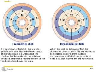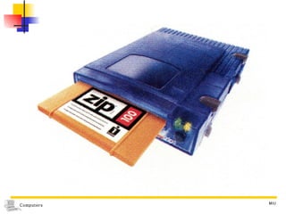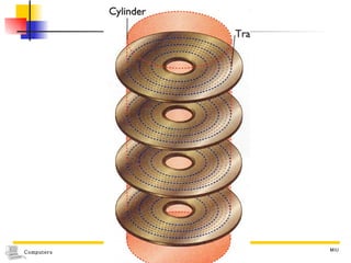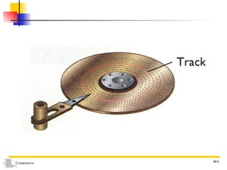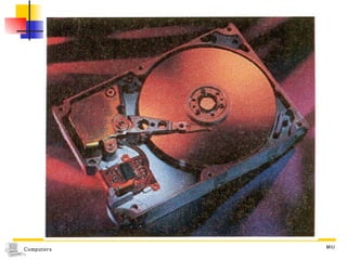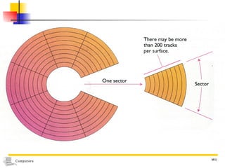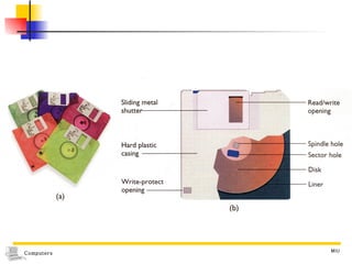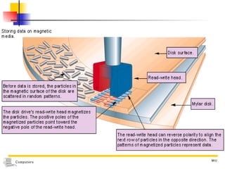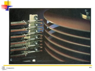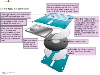 The document discusses different types of secondary storage used in computer systems, focusing on magnetic disk storage. It describes diskettes and hard disks, the basic components and technologies used. Diskettes are flexible and store 1.44 MB or less, while hard disks are rigid platters that can store hundreds of gigabytes. Hard disks assemble multiple platters and use read/write heads to access and transfer data via tracks and sectors.