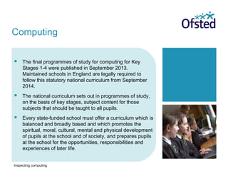 The document outlines the statutory requirements and guidelines for the computing curriculum in England, applicable to maintained schools from September 2014. It emphasizes the importance of a broad and balanced curriculum that includes computer science, information technology, and digital literacy, and provides criteria for evaluating school performance and pupils' achievement in these areas. Additionally, the document addresses the leadership and management aspects necessary for effective computing education, including e-safety measures and resources allocation.