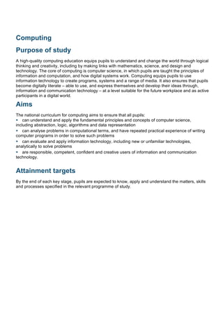 Computing education aims to teach students fundamental computer science principles like logic and algorithms. It also teaches students how to use technology to create programs, systems, and media. The goals are for students to understand computer systems, be able to solve problems computationally, and use technology responsibly. The curriculum outlines what students should learn at each key stage, including understanding algorithms, debugging programs, and using technology safely.