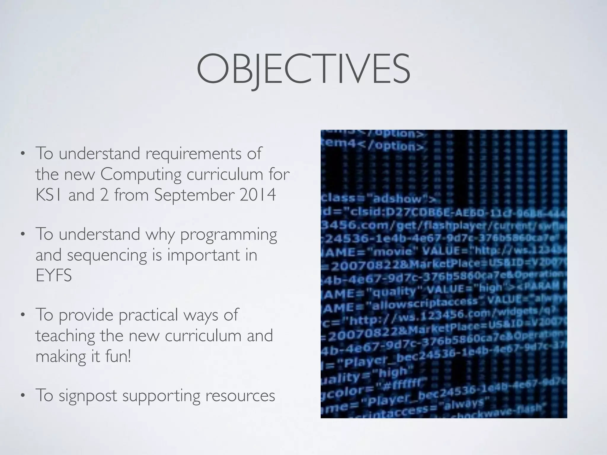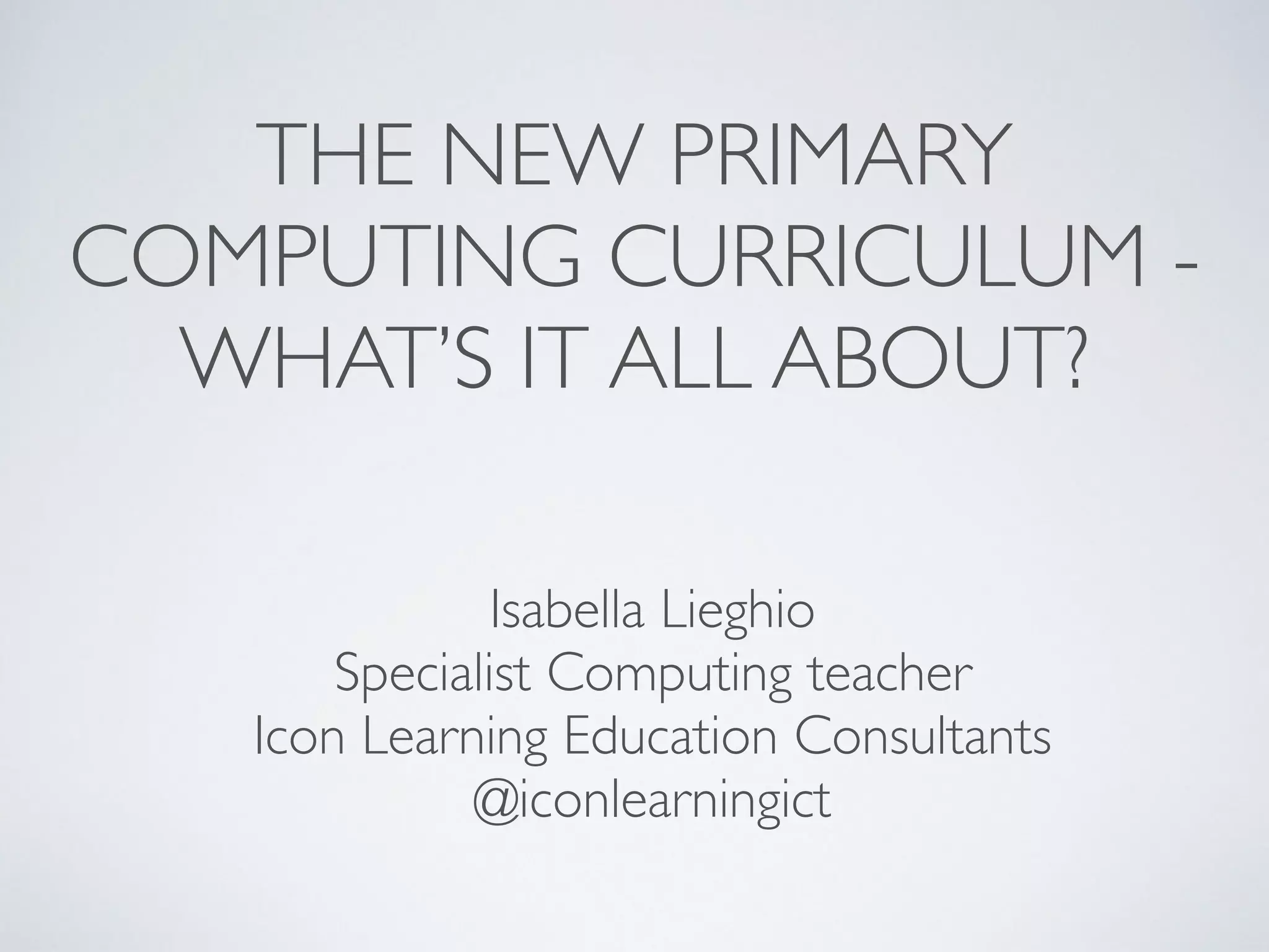 The document discusses the new primary computing curriculum in the UK. It explains that computing involves three main areas: computer science, information technology, and digital literacy. The core of computing is computer science, which teaches pupils about information and computation, how digital systems work, and practical programming. It outlines the key objectives for computing at different primary school key stages, including algorithms, debugging, and using technology safely. It provides examples of programming languages and apps that can be used to teach computing, and emphasizes that computing is about solving problems with logical thinking.