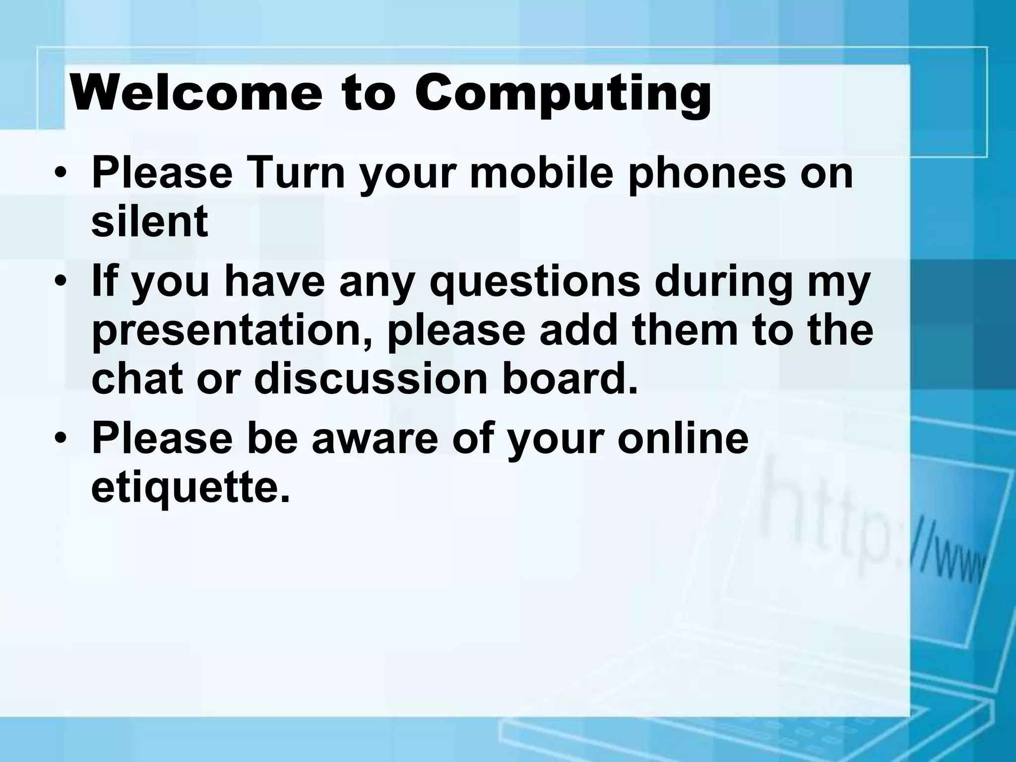 This document provides an overview and breakdown of a computing course. The tutor welcomes students and outlines goals of providing academic and social skills, a supportive learning environment, and helping students make friends and discover interests. The course is broken down into sections on hardware, software, social/organizational factors, browsers/search engines, and practical assignments. Assessments include theory handouts, research assignments, an IT theory assignment, internet browser worksheets, an HTML student project, and continuous assessment. Attendance, being prepared, respect, and following directions are emphasized as class rules. Potential homework issues are outlined.