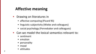 The document discusses computing with affective lexicons. It begins by outlining Scherer's typology of affective states including emotions, moods, interpersonal stances, attitudes, and personality traits. It then describes several existing lexical resources for modeling affective meaning computationally, including sentiment lexicons like the General Inquirer, LIWC, MPQA Subjectivity Cues Lexicon, and SentiWordNet. The document focuses on how these resources can represent the connotations of words and be used for tasks involving sentiment analysis, emotion detection, and modeling other affective states.