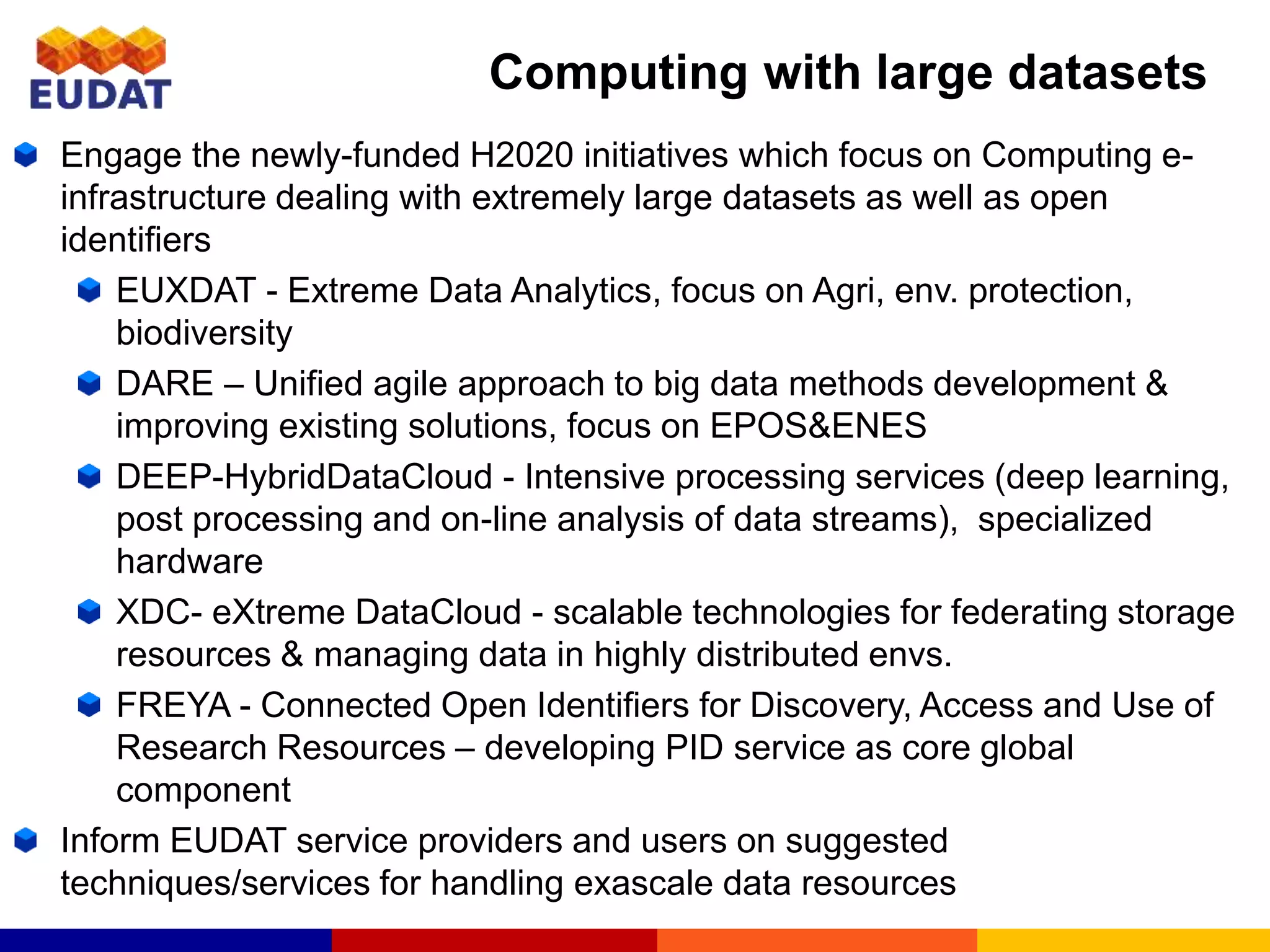 The document discusses several newly-funded H2020 initiatives that focus on computing infrastructure for extremely large datasets and open identifiers. These include EUXDAT for extreme data analytics in areas like agriculture, environmental protection and biodiversity. DARE aims to improve big data methods and solutions for projects like EPOS and ENES. DEEP-HybridDataCloud provides intensive processing services for deep learning, analysis of data streams, and specialized hardware. XDC focuses on scalable technologies for distributed storage and data management. FREYA develops a persistent identifier service as a core component for research resource discovery. It also suggests informing EUDAT users and providers about techniques for exascale data resources and computing with large datasets.