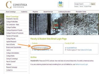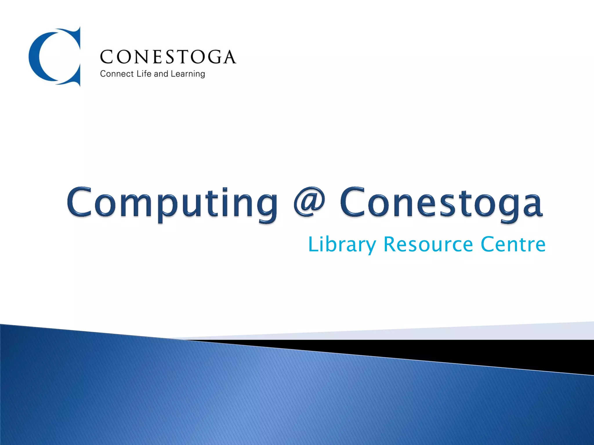 The document provides essential information for students on accessing various resources at Conestoga College, including logging into computers, email, and online systems like the student portal and ANGEL. It outlines rules for password security, printing guidelines, and wireless access, along with contact details for IT services and library support. Additionally, it offers instructions for managing personal storage on campus and accessing library resources both on and off-campus.