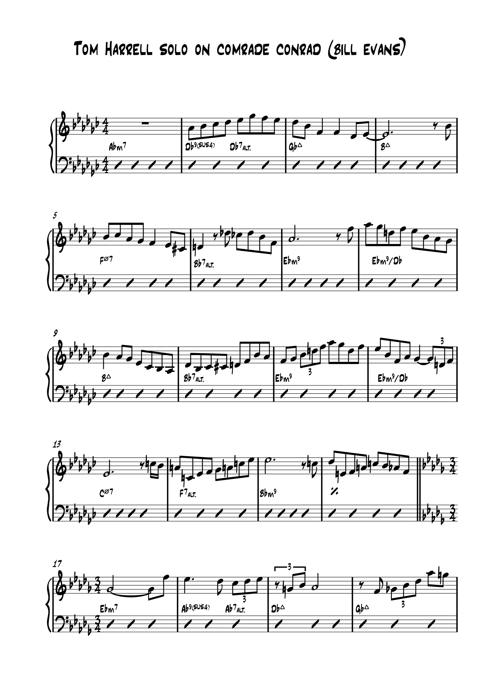 1) The document is a musical score for a jazz solo performance of the song "Comrade Conrad" by Tom Harrell on trumpet.