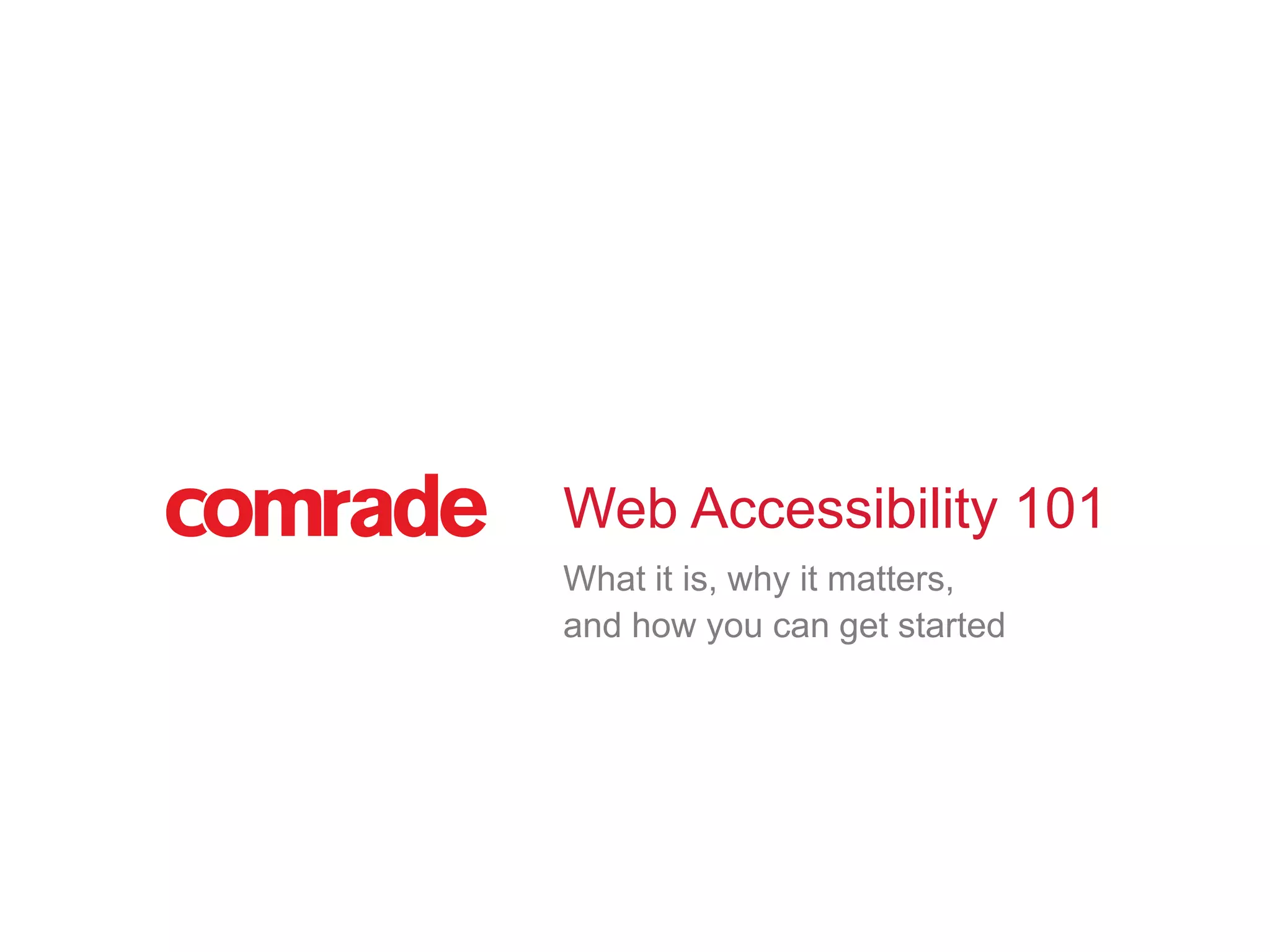 The document introduces web accessibility, which means ensuring equal access to web content for people with disabilities or impairments. It discusses why accessibility is important, including legal requirements and expanding audiences. The four principles of accessible design are that content must be perceivable, operable, understandable and robust. Examples show how specific websites meet criteria like providing text alternatives and keyboard navigation. The document recommends evaluating websites for accessibility gaps and creating a plan to address issues.