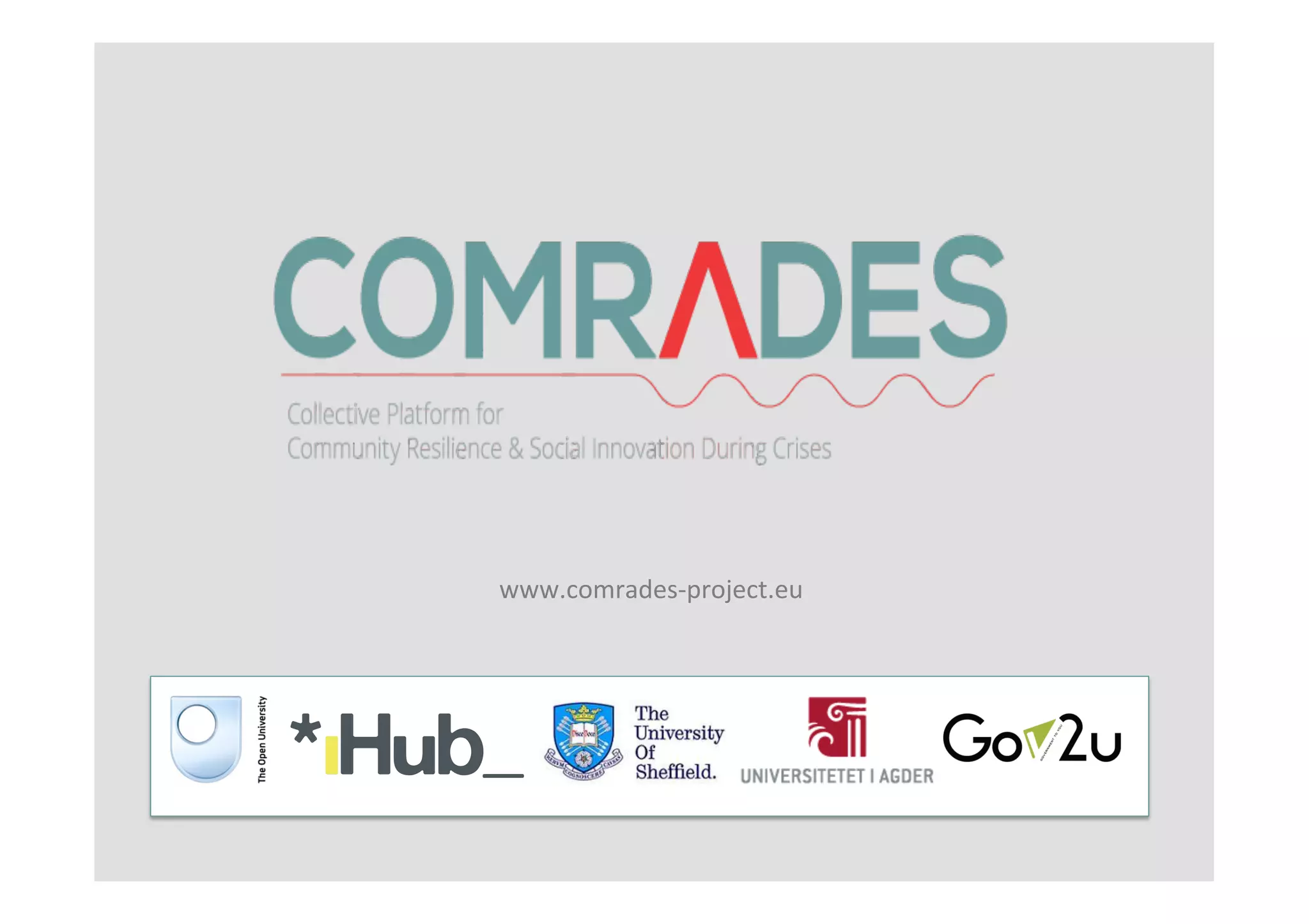 The Comrades project, funded by the Horizon 2020 programme, aims to empower communities during crises through an online platform for reporting emergencies. It enables citizens to share urgent information and facilitates responders in managing and processing these reports effectively. The project's objectives include developing a resilient socio-technical system to assess and monitor crisis situations and enhancing community response capabilities.