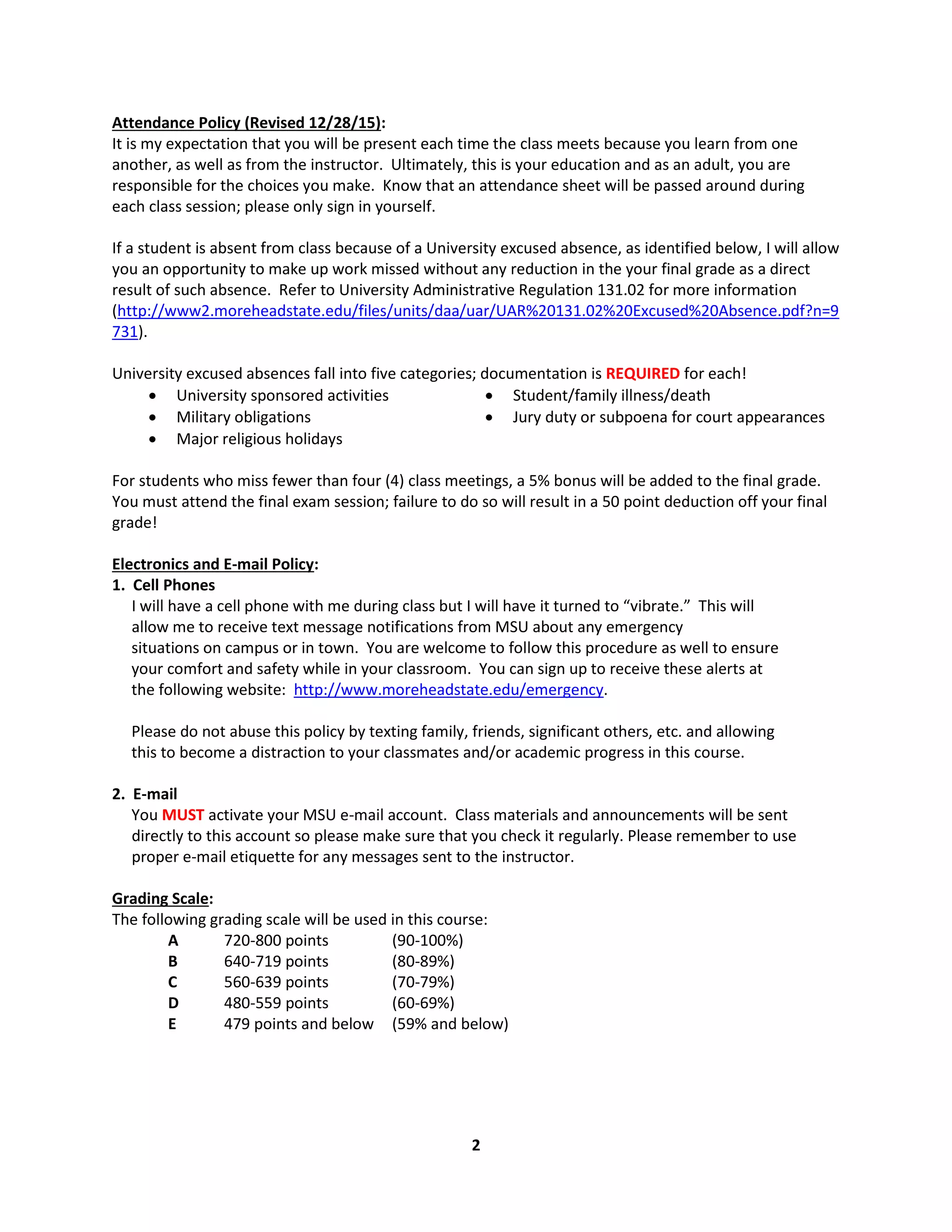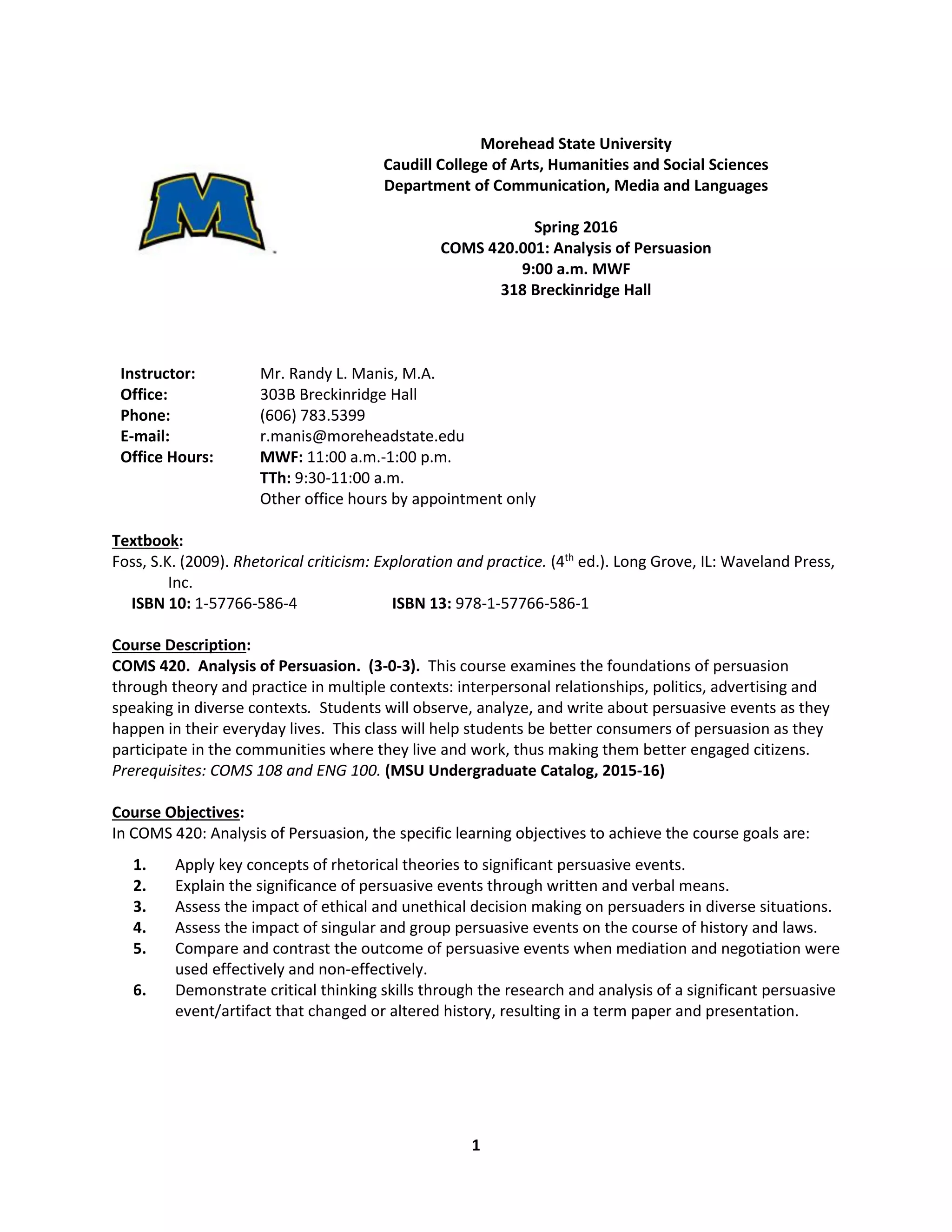 This document provides information about a Persuasion Analysis course taught at Morehead State University in Spring 2016. It outlines the course description, objectives, assignments, grading scale, policies, and tentative schedule. The instructor is Mr. Randy Manis and the course will examine foundations of persuasion through theory and practice in multiple contexts. Assignments include outlines, quizzes, papers, an exam, research paper, and presentation. The document provides details on attendance, electronics, academic honesty, disabilities, and inclement weather policies.