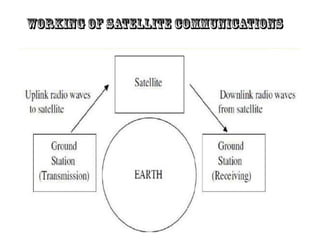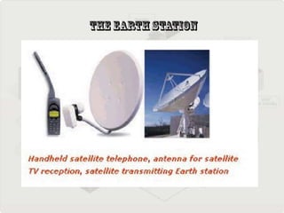 This document provides information about satellite communication. It begins by defining what a satellite is and notes that the first artificial satellite was Sputnik 1 launched by the Soviet Union in 1957. It then discusses how communications satellites work by transmitting signals between an earth station and the satellite. The main components of satellite communication systems are the satellite and the ground station. There are three main types of orbits for satellites: low Earth orbit, medium Earth orbit, and geostationary Earth orbit. The document concludes by discussing some advantages and disadvantages of satellite communication.