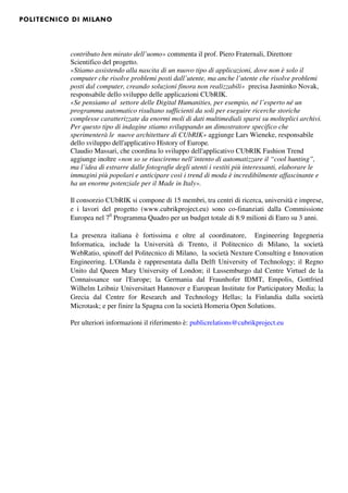 Il progetto Cubrik, sviluppato dal Politecnico di Milano, crea un'architettura di crowdsourcing per applicazioni nella moda, beni culturali e analisi di notizie attraverso la collaborazione tra uomo e computer. In 18 mesi, sono stati realizzati prototipi che permettono di risolvere problemi complessi utilizzando sia l'intuizione umana che l'analisi computazionale. Il progetto coinvolge 15 membri tra università e industrie in tutta Europa e riceve finanziamenti dalla Commissione Europea.