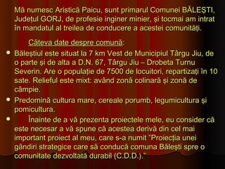 Comuna Bălești, condusă de primarul artistică Paicu, se află la 7 km de Târgu Jiu și are o populație de 7500 de locuitori. Primarul își propune dezvoltarea durabilă a comunității prin îndeplinirea obiectivelor economice, sociale și de mediu, precum și prin atragerea fondurilor externe. Proiectele includ infrastructura de apă și canalizare, înființarea unui serviciu de poliție locală, reabilitarea școlilor și promovarea activităților culturale și de sport.