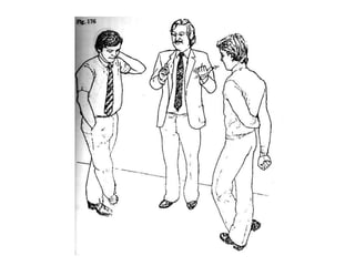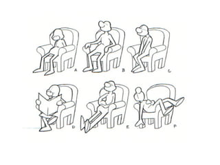 Posició dels braços(creuats al davant o al darrere, caiguts) Posició de les cames (creuades, obertes, estirades) Posició dels peus Posició del cap (aixecat, inclinat) Posició de les mans (ocupades, lliures, en contacte amb el cos) La postura corporal