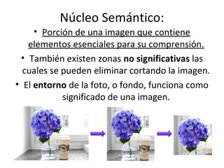El documento habla sobre conceptos clave de la comunicación visual y audiovisual. Explica que una imagen contiene un núcleo semántico con elementos esenciales y zonas no significativas que se pueden eliminar. También describe que el fondo de una foto aporta significado. Además, define la legibilidad como una combinación de nitidez, comprensión y detalles, ni en exceso ni escasos. Finalmente, enumera diferentes tipos de imágenes como iconos, esquemas, infografías, gráficos matemáticos,