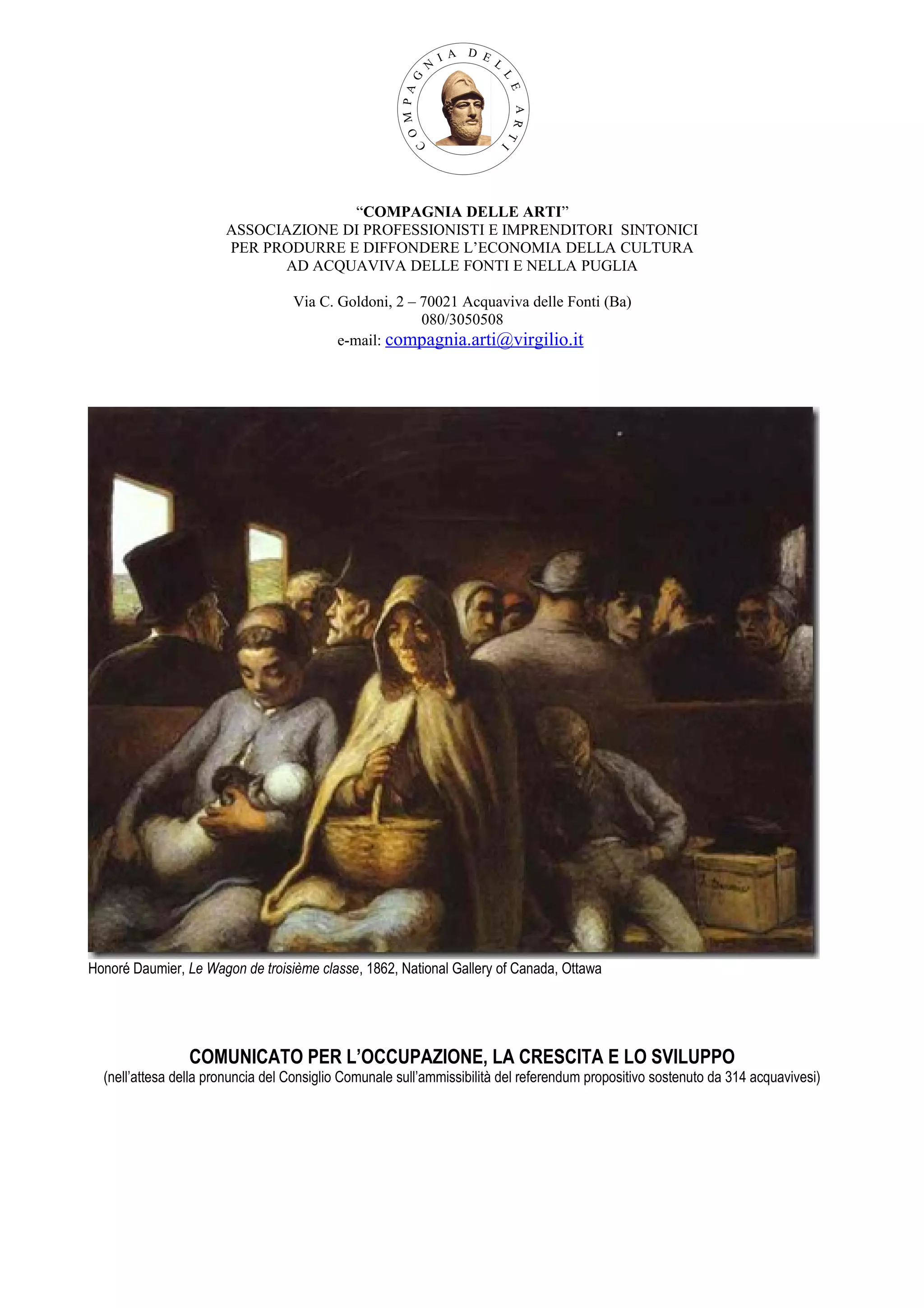 Il documento è un comunicato della 'compagnia delle arti' che critica l'amministrazione comunale di Acquaviva delle Fonti per la mancanza di risorse e strategie di sviluppo, evidenziando l'assenza di un piano regolatore e di misure per favorire occupazione e crescita. Viene segnalata anche la disparità di trattamento tra i cittadini riguardo a progetti di lottizzazione e la gestione dell'urbanistica. Infine, si richiede maggiore attenzione per garantire i principi di proporzionalità e non discriminazione nella pianificazione urbana.