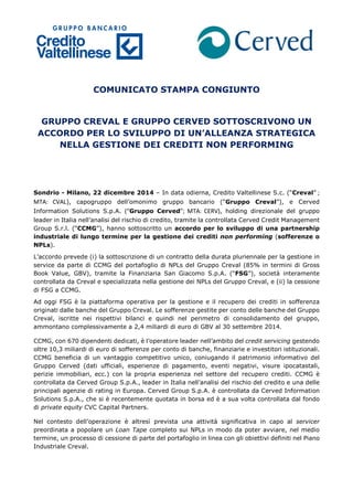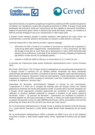 Il Gruppo Creval e il Gruppo Cerved hanno firmato un accordo per una partnership strategica nella gestione dei crediti non performing, consentendo a Cerved di gestire il 85% del portafoglio NPL del Creval tramite la sua controllata CCMG. L'operazione prevede la cessione della società FSG a CCMG per 21,7 milioni di euro e mira a ottimizzare le operazioni di recupero crediti e migliorare i tassi di recupero. La finalizzazione dell'accordo è prevista entro il primo trimestre del 2015.