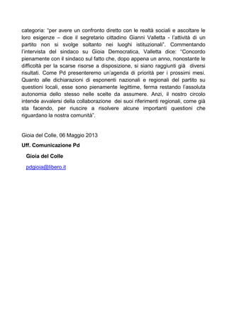 Il circolo del PD di Gioia del Colle ha espresso grande amarezza per le recenti dimissioni del segretario Bersani e le divisioni interne, chiedendo un congresso nazionale urgente per un rilancio del partito e un ricambio generazionale. Si è discusso anche della necessità di formare un governo temporaneo per affrontare le emergenze occupazionali ed economiche, oltre a richiedere l'azzeramento dei vertici nazionali e regionali. Infine, il segretario cittadino Valletta ha sottolineato l'importanza del confronto diretto con le realtà sociali per ascoltare le loro esigenze.