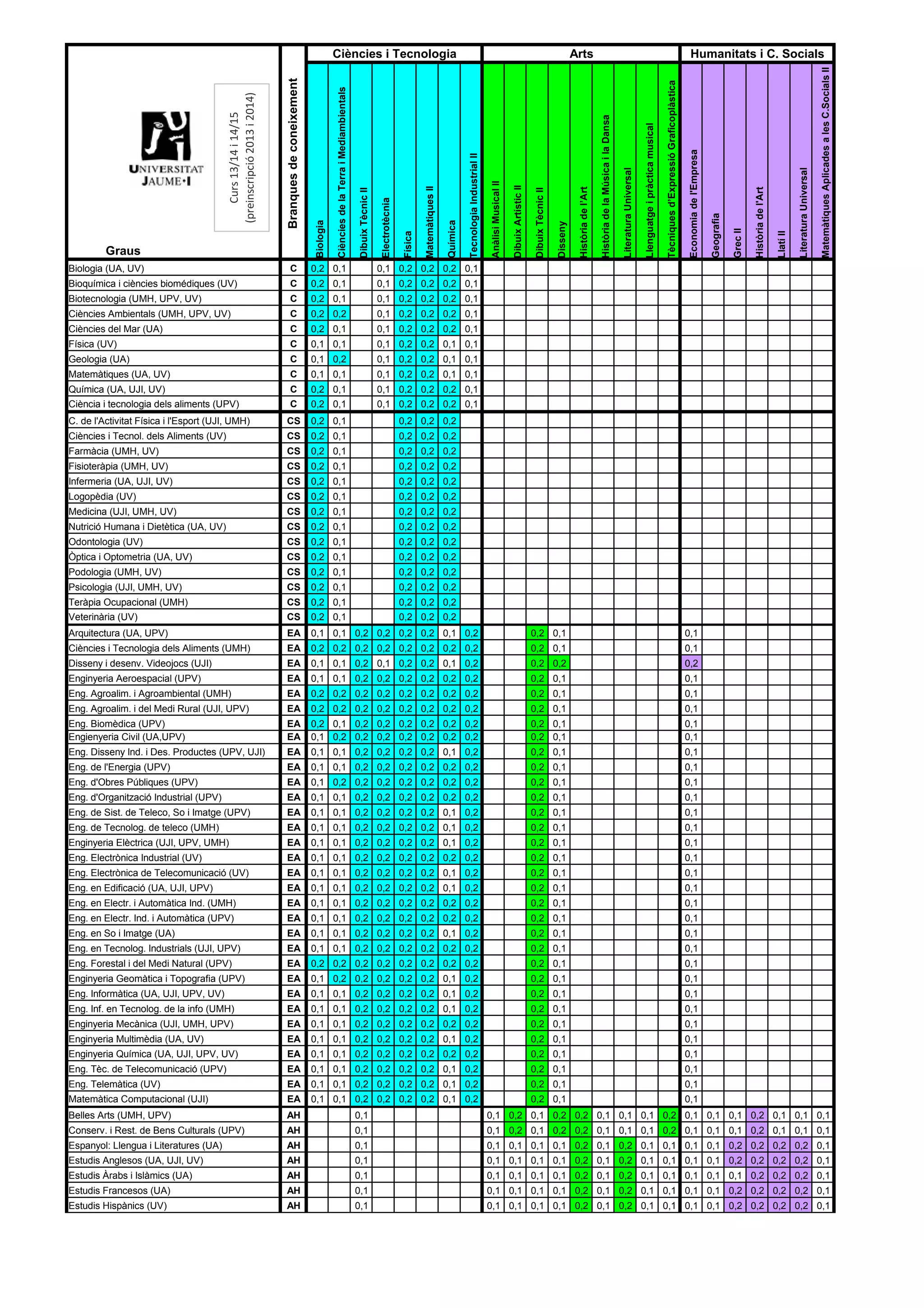 Arts Humanitats i C. Socials Matemàtiques Aplicades a les C.Socials II Branques de coneixement Tècniques d’Expressió Graficoplàstica Ciències de la Terra i Mediambientals (preinscripció 2013 i 2014) Curs 13/14 i 14/15 Història de la Música i la Dansa Llenguatge i pràctica musical Economia de l'Empresa Tecnologia Industrial II Literatura Universal Literatura Universal Anàlisi Musical II Dibuix Artístic II Matemàtiques II Història de l’Art Història de l'Art Dibuix Tècnic II Dibuix Tècnic II Electrotècnia Geografia Biologia Química Disseny Grec II Llatí II Física Graus Biologia (UA, UV) C 0,2 0,1 0,1 0,2 0,2 0,2 0,1 Bioquímica i ciències biomédiques (UV) C 0,2 0,1 0,1 0,2 0,2 0,2 0,1 Biotecnologia (UMH, UPV, UV) C 0,2 0,1 0,1 0,2 0,2 0,2 0,1 Ciències Ambientals (UMH, UPV, UV) C 0,2 0,2 0,1 0,2 0,2 0,2 0,1 Ciències del Mar (UA) C 0,2 0,1 0,1 0,2 0,2 0,2 0,1 Física (UV) C 0,1 0,1 0,1 0,2 0,2 0,1 0,1 Geologia (UA) C 0,1 0,2 0,1 0,2 0,2 0,1 0,1 Matemàtiques (UA, UV) C 0,1 0,1 0,1 0,2 0,2 0,1 0,1 Química (UA, UJI, UV) C 0,2 0,1 0,1 0,2 0,2 0,2 0,1 Ciència i tecnologia dels aliments (UPV) C 0,2 0,1 0,1 0,2 0,2 0,2 0,1 C. de l'Activitat Física i l'Esport (UJI, UMH) CS 0,2 0,1 0,2 0,2 0,2 Ciències i Tecnol. dels Aliments (UV) CS 0,2 0,1 0,2 0,2 0,2 Farmàcia (UMH, UV) CS 0,2 0,1 0,2 0,2 0,2 Fisioteràpia (UMH, UV) CS 0,2 0,1 0,2 0,2 0,2 Infermeria (UA, UJI, UV) CS 0,2 0,1 0,2 0,2 0,2 Logopèdia (UV) CS 0,2 0,1 0,2 0,2 0,2 Medicina (UJI, UMH, UV) CS 0,2 0,1 0,2 0,2 0,2 Nutrició Humana i Dietètica (UA, UV) CS 0,2 0,1 0,2 0,2 0,2 Odontologia (UV) CS 0,2 0,1 0,2 0,2 0,2 Òptica i Optometria (UA, UV) CS 0,2 0,1 0,2 0,2 0,2 Podologia (UMH, UV) CS 0,2 0,1 0,2 0,2 0,2 Psicologia (UJI, UMH, UV) CS 0,2 0,1 0,2 0,2 0,2 Teràpia Ocupacional (UMH) CS 0,2 0,1 0,2 0,2 0,2 Veterinària (UV) CS 0,2 0,1 0,2 0,2 0,2 Arquitectura (UA, UPV) EA 0,1 0,1 0,2 0,2 0,2 0,2 0,1 0,2 0,2 0,1 0,1 Ciències i Tecnologia dels Aliments (UMH) EA 0,2 0,2 0,2 0,2 0,2 0,2 0,2 0,2 0,2 0,1 0,1 Disseny i desenv. Videojocs (UJI) EA 0,1 0,1 0,2 0,1 0,2 0,2 0,1 0,2 0,2 0,2 0,2 Enginyeria Aeroespacial (UPV) EA 0,1 0,1 0,2 0,2 0,2 0,2 0,2 0,2 0,2 0,1 0,1 Eng. Agroalim. i Agroambiental (UMH) EA 0,2 0,2 0,2 0,2 0,2 0,2 0,2 0,2 0,2 0,1 0,1 Eng. Agroalim. i del Medi Rural (UJI, UPV) EA 0,2 0,2 0,2 0,2 0,2 0,2 0,2 0,2 0,2 0,1 0,1 Eng. Biomèdica (UPV) EA 0,2 0,1 0,2 0,2 0,2 0,2 0,2 0,2 0,2 0,1 0,1 Engienyeria Civil (UA,UPV) EA 0,1 0,2 0,2 0,2 0,2 0,2 0,2 0,2 0,2 0,1 0,1 Eng. Disseny Ind. i Des. Productes (UPV, UJI) EA 0,1 0,1 0,2 0,2 0,2 0,2 0,1 0,2 0,2 0,1 0,1 Eng. de l'Energia (UPV) EA 0,1 0,1 0,2 0,2 0,2 0,2 0,2 0,2 0,2 0,1 0,1 Eng. d'Obres Públiques (UPV) EA 0,1 0,2 0,2 0,2 0,2 0,2 0,2 0,2 0,2 0,1 0,1 Eng. d'Organització Industrial (UPV) EA 0,1 0,1 0,2 0,2 0,2 0,2 0,2 0,2 0,2 0,1 0,1 Eng. de Sist. de Teleco, So i Imatge (UPV) EA 0,1 0,1 0,2 0,2 0,2 0,2 0,1 0,2 0,2 0,1 0,1 Eng. de Tecnolog. de teleco (UMH) EA 0,1 0,1 0,2 0,2 0,2 0,2 0,1 0,2 0,2 0,1 0,1 Enginyeria Elèctrica (UJI, UPV, UMH) EA 0,1 0,1 0,2 0,2 0,2 0,2 0,1 0,2 0,2 0,1 0,1 Eng. Electrònica Industrial (UV) EA 0,1 0,1 0,2 0,2 0,2 0,2 0,2 0,2 0,2 0,1 0,1 Eng. Electrònica de Telecomunicació (UV) EA 0,1 0,1 0,2 0,2 0,2 0,2 0,1 0,2 0,2 0,1 0,1 Eng. en Edificació (UA, UJI, UPV) EA 0,1 0,1 0,2 0,2 0,2 0,2 0,1 0,2 0,2 0,1 0,1 Eng. en Electr. i Automàtica Ind. (UMH) EA 0,1 0,1 0,2 0,2 0,2 0,2 0,2 0,2 0,2 0,1 0,1 Eng. en Electr. Ind. i Automàtica (UPV) EA 0,1 0,1 0,2 0,2 0,2 0,2 0,2 0,2 0,2 0,1 0,1 Eng. en So i Imatge (UA) EA 0,1 0,1 0,2 0,2 0,2 0,2 0,1 0,2 0,2 0,1 0,1 Eng. en Tecnolog. Industrials (UJI, UPV) EA 0,1 0,1 0,2 0,2 0,2 0,2 0,2 0,2 0,2 0,1 0,1 Eng. Forestal i del Medi Natural (UPV) EA 0,2 0,2 0,2 0,2 0,2 0,2 0,2 0,2 0,2 0,1 0,1 Enginyeria Geomàtica i Topografia (UPV) EA 0,1 0,2 0,2 0,2 0,2 0,2 0,1 0,2 0,2 0,1 0,1 Eng. Informàtica (UA, UJI, UPV, UV) EA 0,1 0,1 0,2 0,2 0,2 0,2 0,1 0,2 0,2 0,1 0,1 Eng. Inf. en Tecnolog. de la info (UMH) EA 0,1 0,1 0,2 0,2 0,2 0,2 0,1 0,2 0,2 0,1 0,1 Enginyeria Mecànica (UJI, UMH, UPV) EA 0,1 0,1 0,2 0,2 0,2 0,2 0,2 0,2 0,2 0,1 0,1 Enginyeria Multimèdia (UA, UV) EA 0,1 0,1 0,2 0,2 0,2 0,2 0,1 0,2 0,2 0,1 0,1 Enginyeria Química (UA, UJI, UPV, UV) EA 0,1 0,1 0,2 0,2 0,2 0,2 0,2 0,2 0,2 0,1 0,1 Eng. Tèc. de Telecomunicació (UPV) EA 0,1 0,1 0,2 0,2 0,2 0,2 0,1 0,2 0,2 0,1 0,1 Eng. Telemàtica (UV) EA 0,1 0,1 0,2 0,2 0,2 0,2 0,1 0,2 0,2 0,1 0,1 Matemàtica Computacional (UJI) EA 0,1 0,1 0,2 0,2 0,2 0,2 0,1 0,2 0,2 0,1 0,1 Belles Arts (UMH, UPV) AH 0,1 0,1 0,2 0,1 0,2 0,2 0,1 0,1 0,1 0,2 0,1 0,1 0,1 0,2 0,1 0,1 0,1 Conserv. i Rest. de Bens Culturals (UPV) AH 0,1 0,1 0,2 0,1 0,2 0,2 0,1 0,1 0,1 0,2 0,1 0,1 0,1 0,2 0,1 0,1 0,1 Espanyol: Llengua i Literatures (UA) AH 0,1 0,1 0,1 0,1 0,1 0,2 0,1 0,2 0,1 0,1 0,1 0,1 0,2 0,2 0,2 0,2 0,1 Estudis Anglesos (UA, UJI, UV) AH 0,1 0,1 0,1 0,1 0,1 0,2 0,1 0,2 0,1 0,1 0,1 0,1 0,2 0,2 0,2 0,2 0,1 Estudis Àrabs i Islàmics (UA) AH 0,1 0,1 0,1 0,1 0,1 0,2 0,1 0,2 0,1 0,1 0,1 0,1 0,1 0,2 0,2 0,2 0,1 Estudis Francesos (UA) AH 0,1 0,1 0,1 0,1 0,1 0,2 0,1 0,2 0,1 0,1 0,1 0,1 0,2 0,2 0,2 0,2 0,1 Estudis Hispànics (UV) AH 0,1 0,1 0,1 0,1 0,1 0,2 0,1 0,2 0,1 0,1 0,1 0,1 0,2 0,2 0,2 0,2 0,1