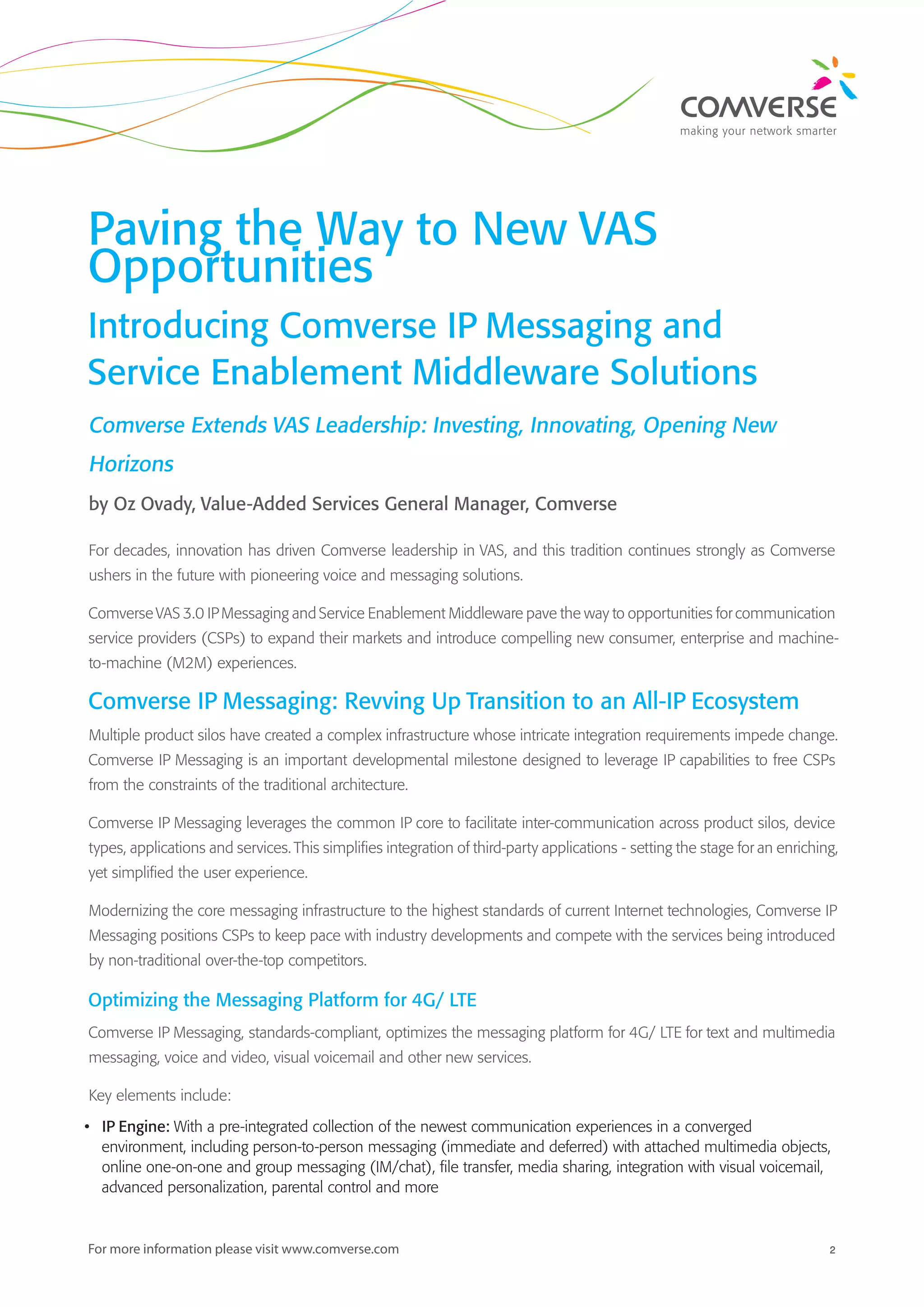 Comverse introduces its IP messaging and service enablement middleware solutions, enhancing communication service providers' capabilities to expand their markets and offer new consumer and enterprise experiences. The solutions leverage IP technology to modernize messaging platforms, optimize for 4G/LTE, and integrate with third-party applications while maintaining legacy systems. With effective middleware and intelligent mediation capabilities, Comverse empowers operators to monetize their services and connect with various industries and applications in a more agile and efficient manner.