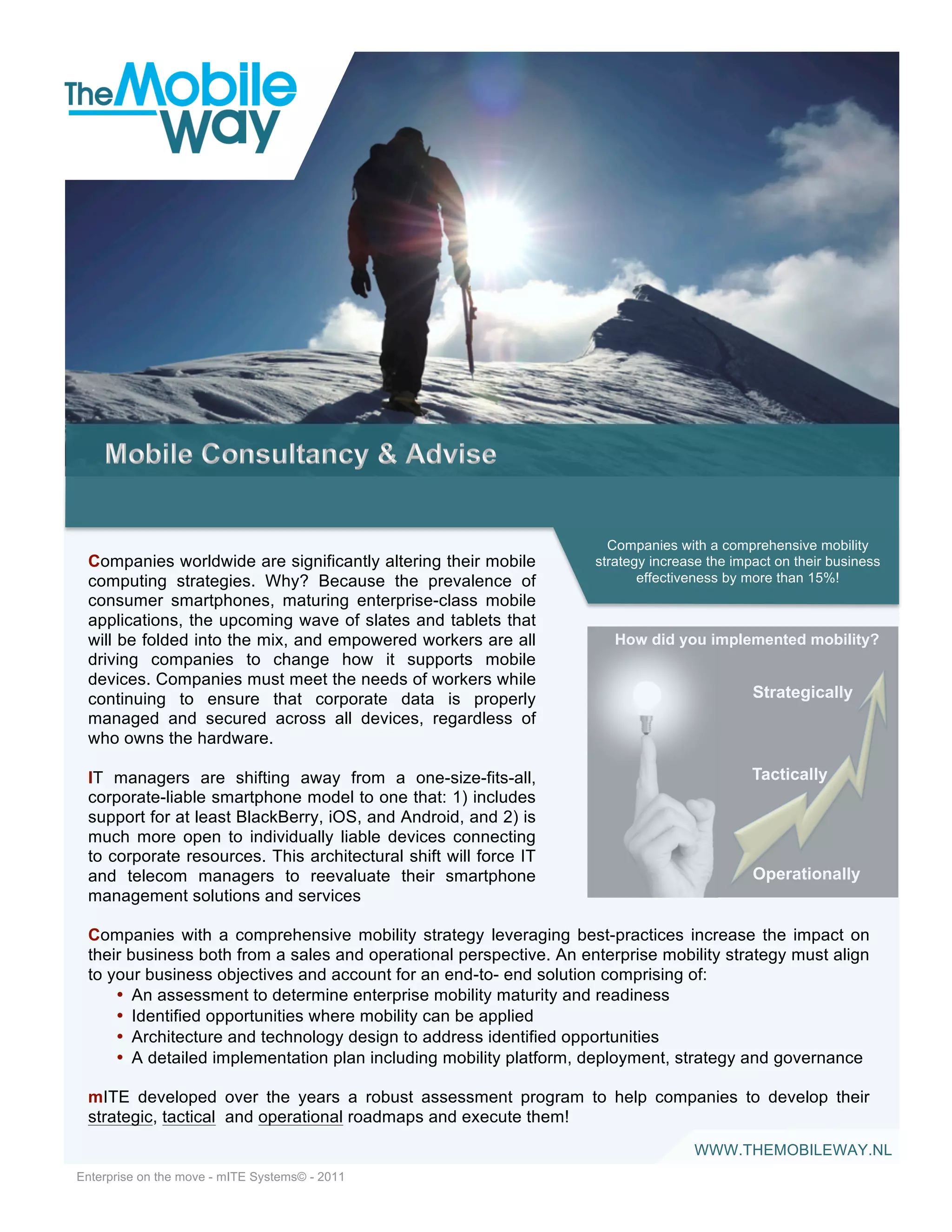 Companies are significantly changing their mobile computing strategies due to the rise of smartphones, mobile applications, tablets, and empowered mobile workers. IT managers are shifting to support multiple mobile platforms, both corporate and personal devices. Companies with a comprehensive mobility strategy can increase business impact by over 15% by leveraging best practices. A mobility strategy must align with business objectives and include an assessment, identifying opportunities for mobility, an architectural design, and implementation plan.