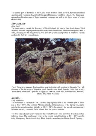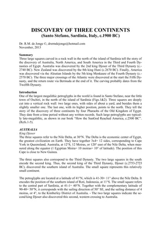 The document discusses petroglyphs in Sardinia that commemorate the ancient Egyptian discoveries of Australia, North America, and South America during the Old Kingdom. It outlines the rulers associated with these discoveries, including Kings Djoser, Huni, and Menkaure, detailing their reigns and the techniques used to convey geographic information through carved symbols. The findings suggest these monumental carvings date back to the Middle Kingdom, highlighting cultural exchanges and navigation capabilities of ancient civilizations.