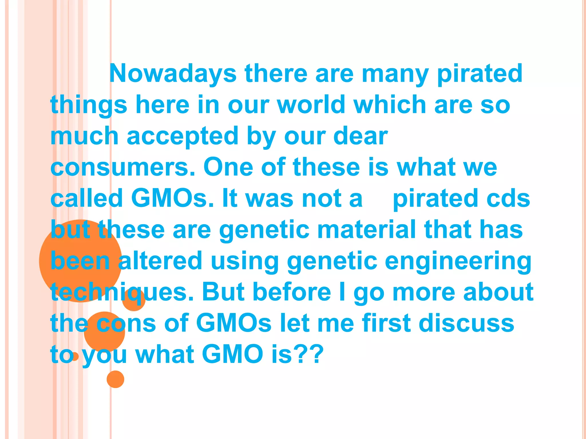 Genetically modified organisms (GMOs) are created using recombinant DNA technology to alter an organism's genes. While proponents argue GMOs can increase crop yields and resistance to pests, there are also many potential risks and uncertainties. These include unintended harm to other organisms from toxic genes, the development of undesirable traits in GMOs, reduced biodiversity as only a single type of plant is grown, and gene contamination of other species. The long-term and indirect effects of GMOs on ecosystems, soil microbes, and human and animal health are difficult to predict due to the unpredictability of where genes insert into genomes and whether they spread from GMOs. The precautionary principle argues that given these uncertainties, commercialization of
