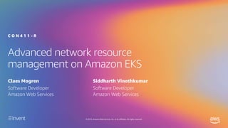 The document discusses advanced network resource management within Amazon EKS, focusing on the AWS Container Network Interface (CNI) solutions, architecture, and configuration details. It covers the benefits and challenges of the Amazon VPC CNI, recent changes, and future enhancements in networking capabilities. Additionally, it highlights the role of the Amazon VPC Resource Controller in managing network resources and optimizing scheduling processes in Kubernetes environments.