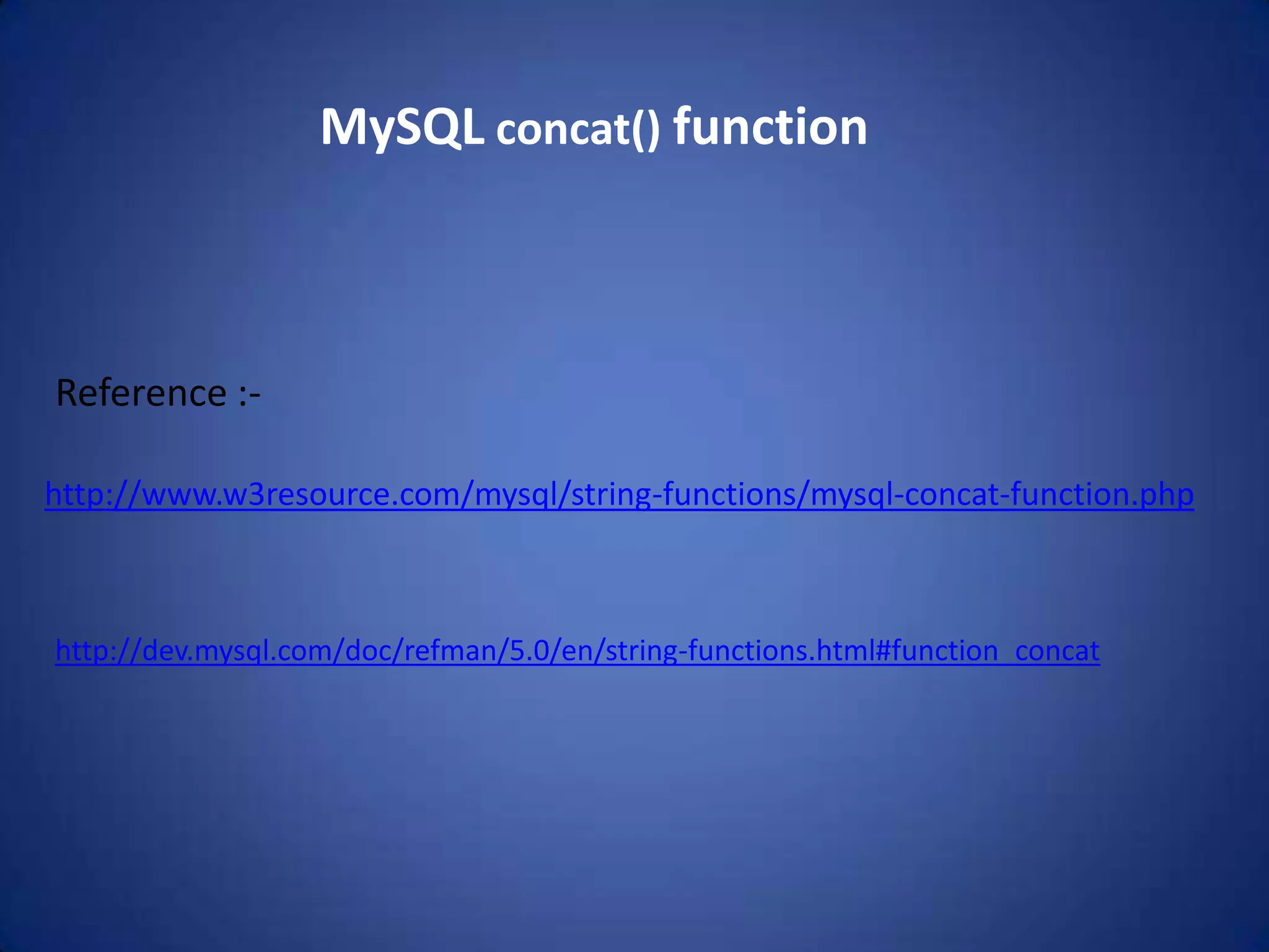 The MySQL CONCAT() function concatenates two or more strings by adding them together and returning the concatenated string. It will return a non-binary string if all arguments are non-binary, and a binary string if any argument is binary. Numeric arguments are also converted to their binary string equivalent. The CONCAT() function takes two or more string arguments and returns their concatenated value.