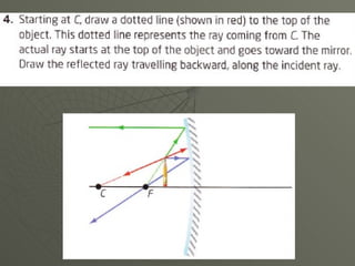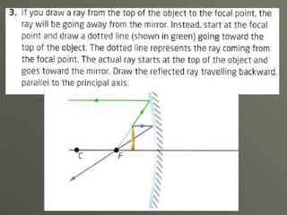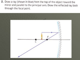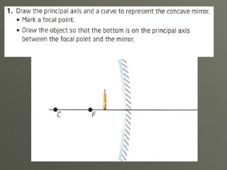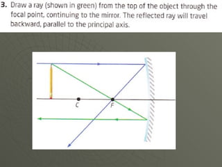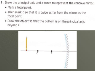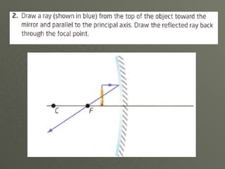 Concave mirrors reflect light inwards like the inside of a bowl. Rays of light hitting any point on the curved mirror behave as if they are hitting a flat plane at that point. All the imaginary normal lines drawn from points on the curved surface meet at the center of curvature. Rays parallel to the principal axis, which runs through the vertex and center of curvature, meet at the focal point. The location and orientation of the mirror's image depends on where the object is placed relative to the focal point and center of curvature.