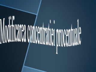 Documentul discută conceptul de concentrație a soluțiilor și metoda de calcul necesară pentru a modifica concentrația prin evaporare sau adăugarea de solut. Se oferă exemple specifice de soluții cu sare și alcool, inclusiv formule pentru calcularea concentrațiilor finale. Se menționează, de asemenea, modalitățile de a mări sau micșora concentrația soluțiilor.