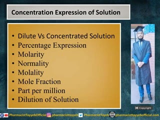 The lecture discusses the principles of solution concentration, defining terms such as dilute and concentrated solutions, and various methods of expressing concentration, including percentage, molarity, normality, and molality. It provides explanations and examples for each concentration expression type along with techniques for diluting solutions. The lecture concludes with a reminder to subscribe for further content and specifies its completion.