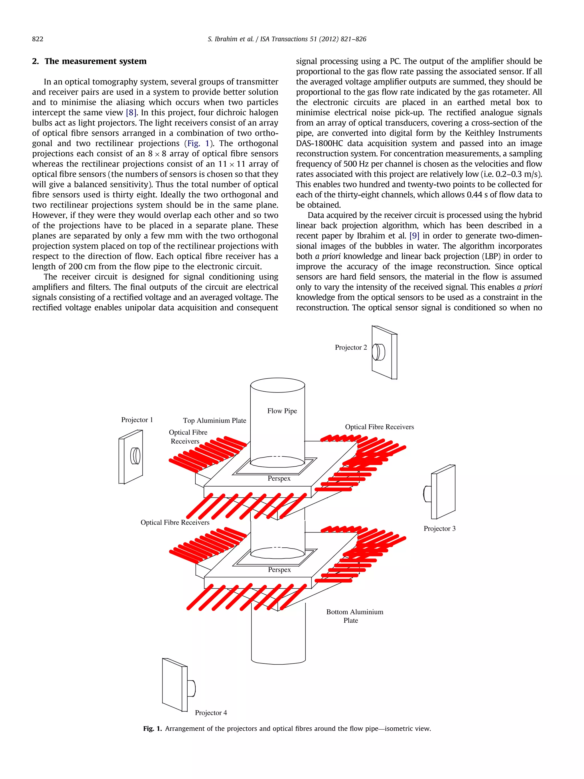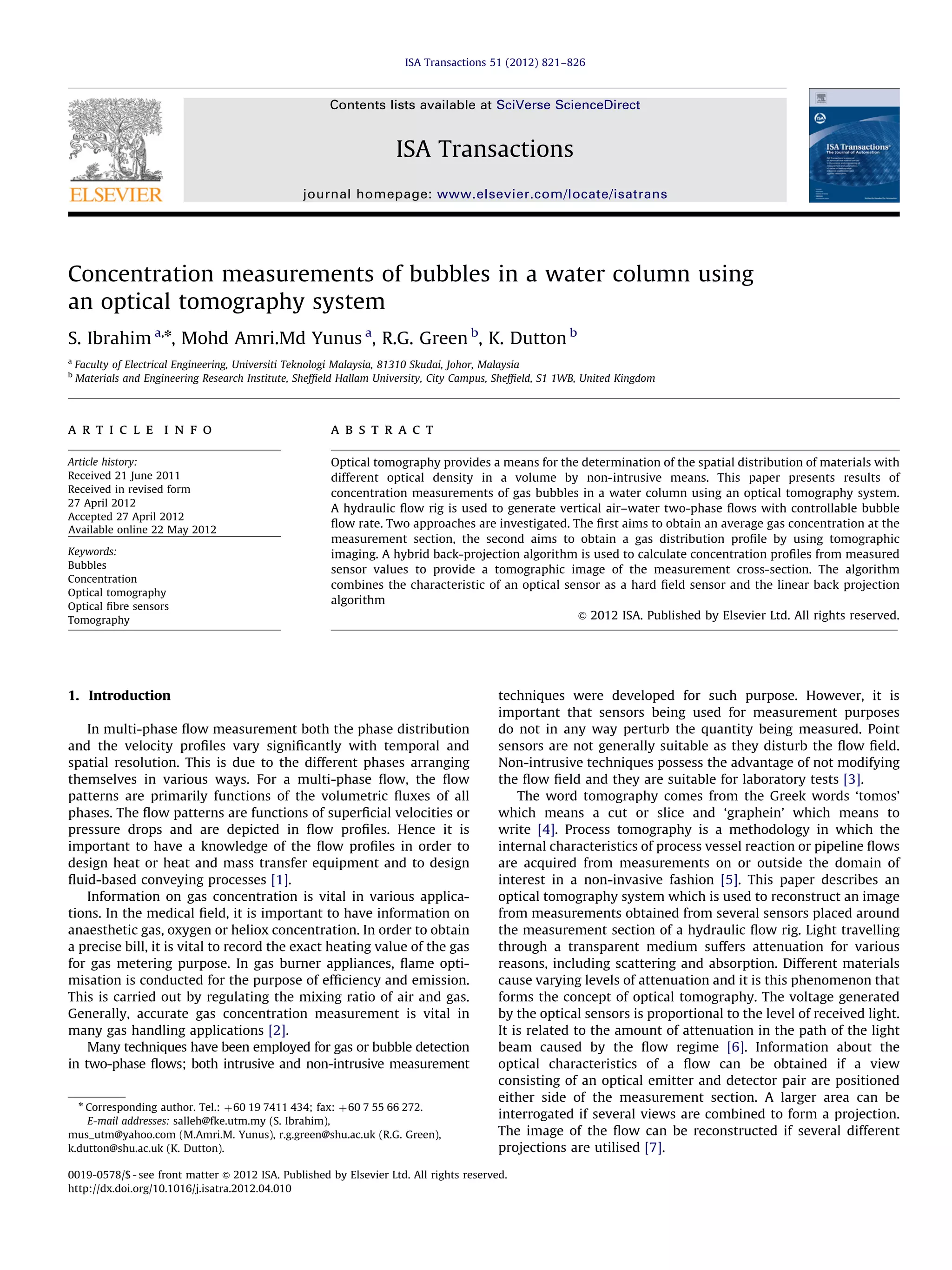 This document presents a study on the use of an optical tomography system to measure the concentration of gas bubbles in a water column. The system employs a hydraulic flow rig and a hybrid back-projection algorithm to generate two-dimensional images of bubble distributions, which are important for applications in various fields, including medical and gas handling. Results demonstrate the capability of the system to accurately measure and visualize gas concentrations at different flow rates and bubble sizes.