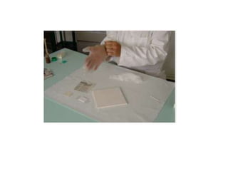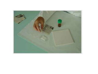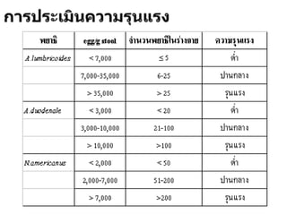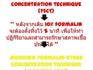 The document discusses techniques for stool examination including qualitative and quantitative methods. For qualitative examination, simple smear and Kato-Katz techniques are described. Quantitative methods include Stoll's dilution egg count and Kato-Katz technique. The Kato-Katz technique involves pressing a fixed amount of stool (typically 41.7 mg) through a cellophane filter, then examining the filter under a microscope to identify and count parasites. Concentration techniques like sedimentation, flotation in brine, sugar solution, or zinc sulfate are used to detect parasites that may otherwise be missed on direct smear.