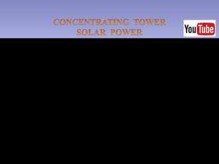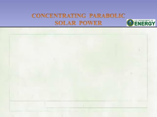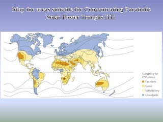 The document provides an overview of concentrated solar power (CSP) technologies, detailing various types of solar collectors like parabolic troughs, dishes, and solar power towers. It highlights the operational characteristics, efficiency, and commercial status of these systems, emphasizing their potential for clean energy generation and integration into power grids. CSP is presented as a promising non-conventional energy source essential for future energy needs.