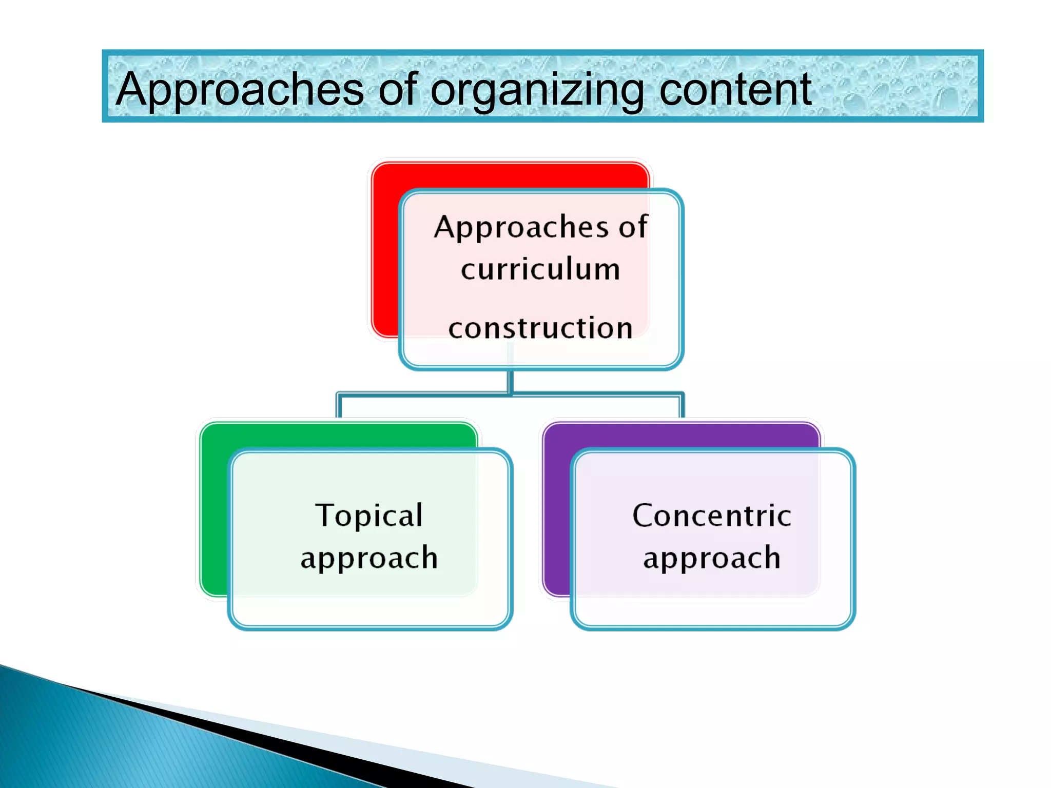 The concentric circles approach to organizing content involves introducing a subject matter over multiple years, with elementary knowledge provided in introductory years and more advanced knowledge added each subsequent year. A topic is broken into sub-topics that are allotted to different classes based on difficulty. This allows steady, gradual coverage of a topic from basic to full knowledge. It is considered a psychologically sound approach that maintains student interest through revision and presentation of small portions over time to create lasting impressions. Teachers must take care that topics are neither too long nor too short each year.