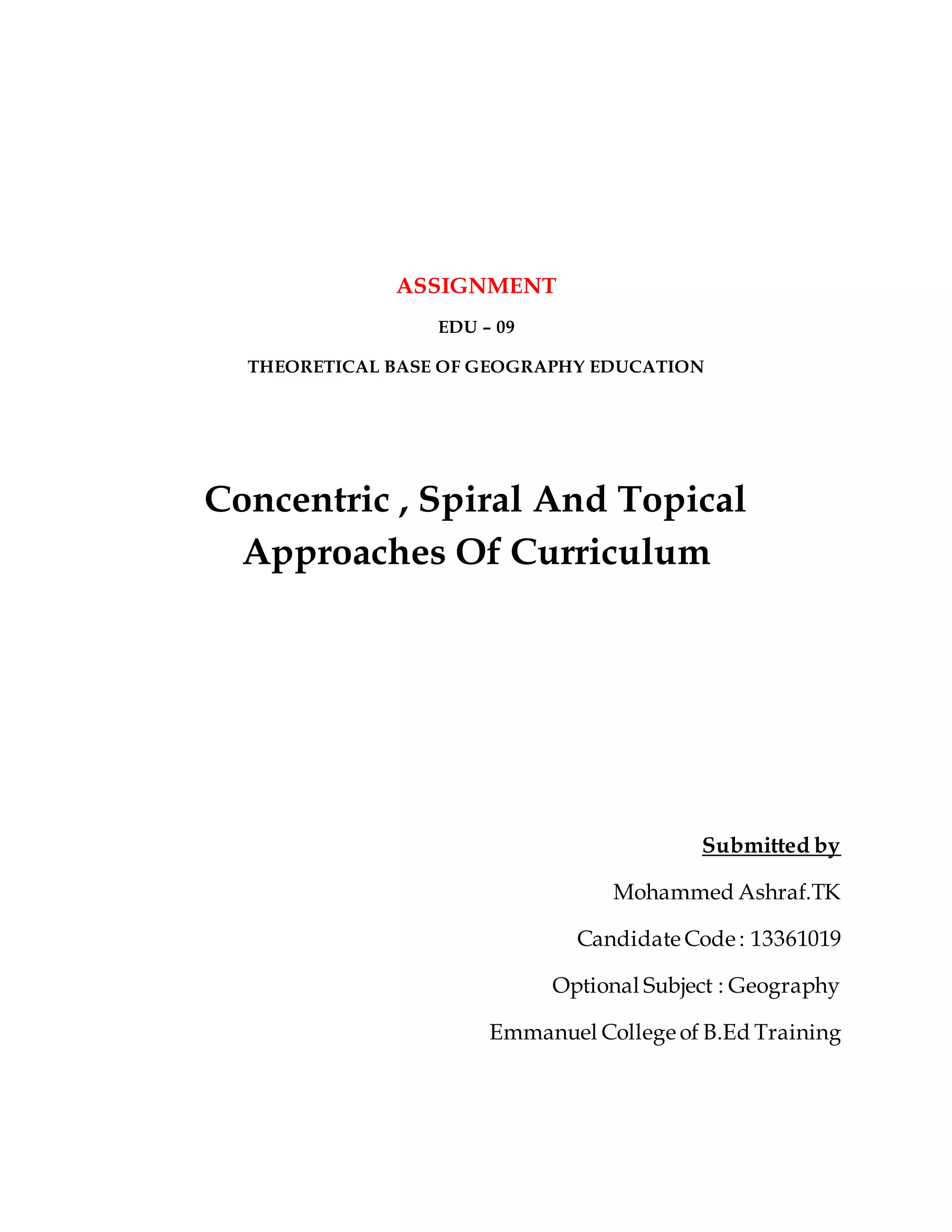 This document discusses different approaches to curriculum development, including concentric, spiral, and topical approaches. The concentric approach presents topics at a general level initially and builds on them each year according to student development. The spiral approach also builds on topics each year while maintaining continuity. The topical approach deals with topics as comprehensive collections of related learning materials to provide a holistic understanding of an area before moving to another topic. An example for each approach is provided for how geography education could be structured.