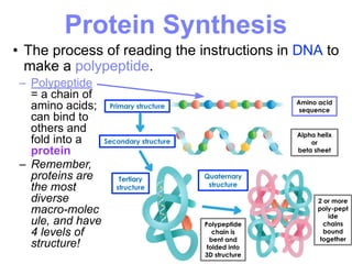 This document summarizes the process of protein synthesis, which occurs in two main steps - transcription and translation. In transcription, DNA in the nucleus is copied into messenger RNA (mRNA) using complementary base pairing. The mRNA then exits the nucleus and binds to ribosomes in the cytoplasm. In translation, the mRNA is read by the ribosome, which uses transfer RNA (tRNA) molecules to translate the mRNA codons into amino acids and assemble them into a polypeptide chain. Although all cells contain the same DNA, gene expression is regulated at the transcriptional and translational levels, allowing different proteins to be produced in different cell types.