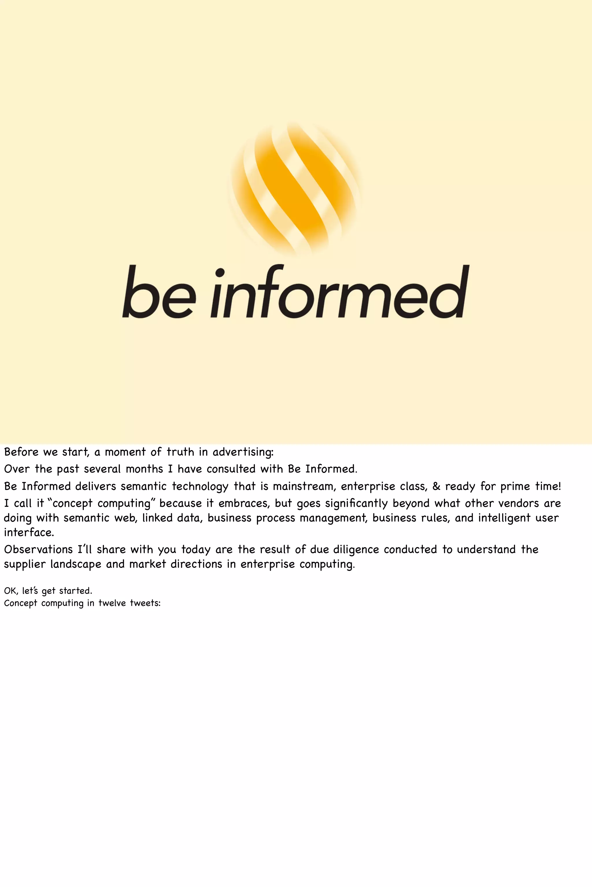 The document discusses 'concept computing,' a paradigm shift in enterprise computing that utilizes semantic model-driven technology to enhance user experience and system capabilities. It addresses legacy issues with previous technologies, emphasizing the robustness and scalability of concept computing, which simplifies the development process and integrates various models into a unified environment. The author highlights the benefits of this approach, including reduced costs, faster development, and improved adaptability in systems, showcasing the company 'Be Informed' as a leader in this field.